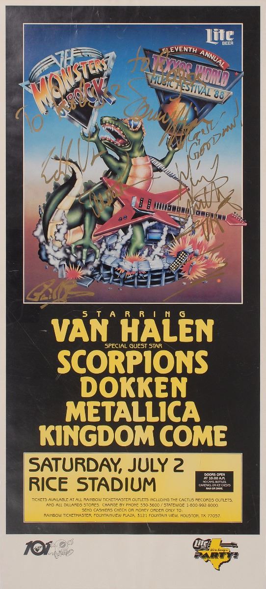 Color 16.25 x 36 poster advertising ‘Monsters of Rock’ at Rice Stadium in Houston on July 2, 1988, signed and inscribed in gold ink by Eddie Van Halen, Alex Van Halen, Sammy Hagar, Michael Anthony, and Scorpions bassist Francis Buchholz. Rolled and in fine condition. Accompanied by a full letter of authenticity from REAL.