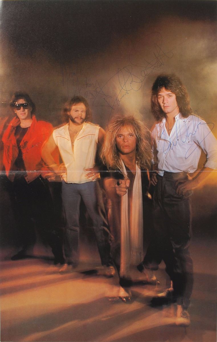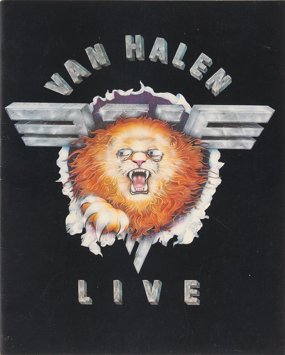 Sought-after Van Halen Live ‘lion’ program from the 1982 Hide Your Sheep tour, 11 x 14, fourteen pages, featuring a huge assortment of entertaining behind-the-scene photos, signed on the centerfold in blue ballpoint, “Alex Van Halen,” “Michael Anthony, VH,” “David Lee Roth,” and “Edward Van Halen.” In fine condition.
