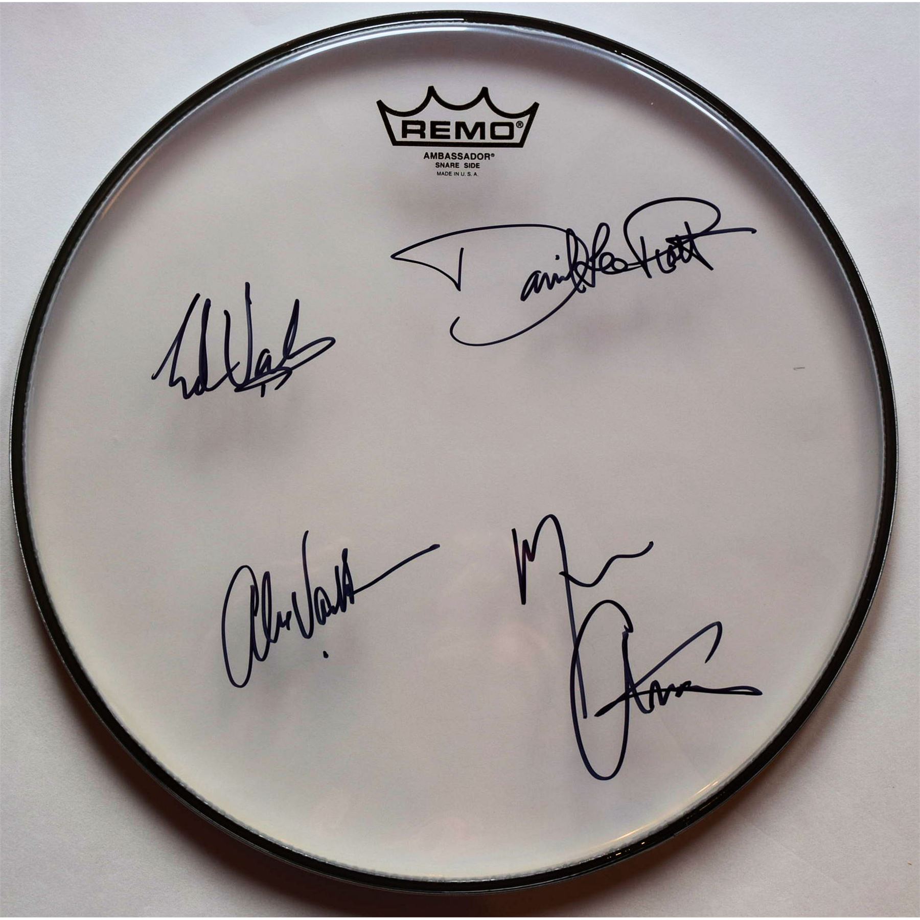 Van Halen signed 13 Inch Clear Remo Drum Head. Signed: David Lee Roth, Eddie Van Halen, Alex Van Halen, and Michael Anthony.