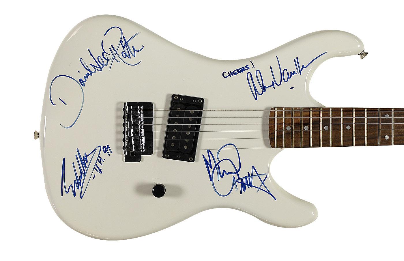 Cream-colored Kramer Aerostar electric guitar, signed on the body in blue felt tip by David Lee Roth, Michael Anthony, Eddie Van Halen, adding “VH 97,” and Alex Van Halen, adding “Cheers!.” In fine condition. Oversized.