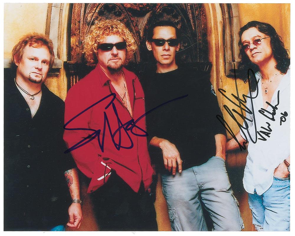 Color glossy 10 x 8 photo of the group from their reunion with Sammy Hagar, signed in blue felt tip by Hagar and black felt by Eddie Van Halen, adding “Van Halen 06.” In very fine condition.