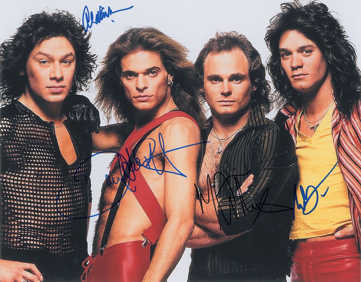 Color satin-finish 14 x 11 photo of the band from early in their career, signed in blue felt tip by David Lee Roth, Eddie Van Halen, and Alex Van Halen, and in black felt tip by Michael Anthony. In fine condition, with some scattered light bends and creases and some light contrast to Anthony’s signature.