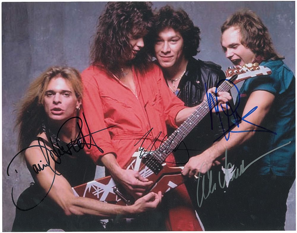 Color satin-finish 14 x 11 photo of the original members, signed in felt tip and ink by Eddie and Alex Van Halen, Michael Anthony, and David Lee Roth. In fine condition, with some light contrast to Eddie’s signature.