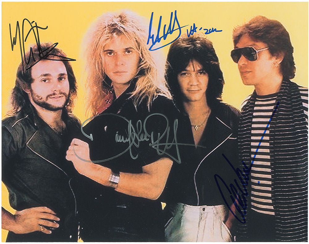 Color satin-finish 14 x 11 photo of the original line-up, signed in blue felt tip by Eddie and Alex Van Halen, in silver ink by David Lee Roth, and in black felt tip by Michael Anthony. In fine condition, with moderate contrast to Alex’s signature.