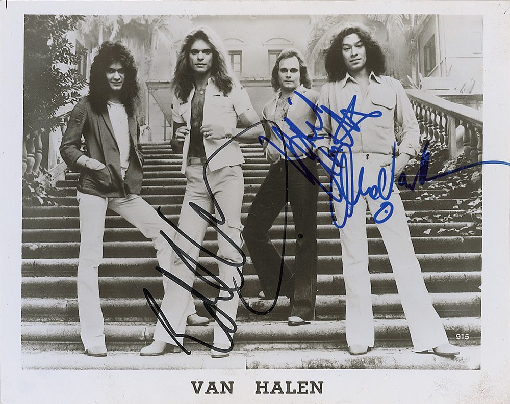 Glossy 10 x 8 group photo, signed in-person in black felt tip by Eddie Van Halen and in blue felt tip by Alex Van Halen and Michael Anthony. In fine condition. Originally obtained by in-person specialist Mike Wehrmann.