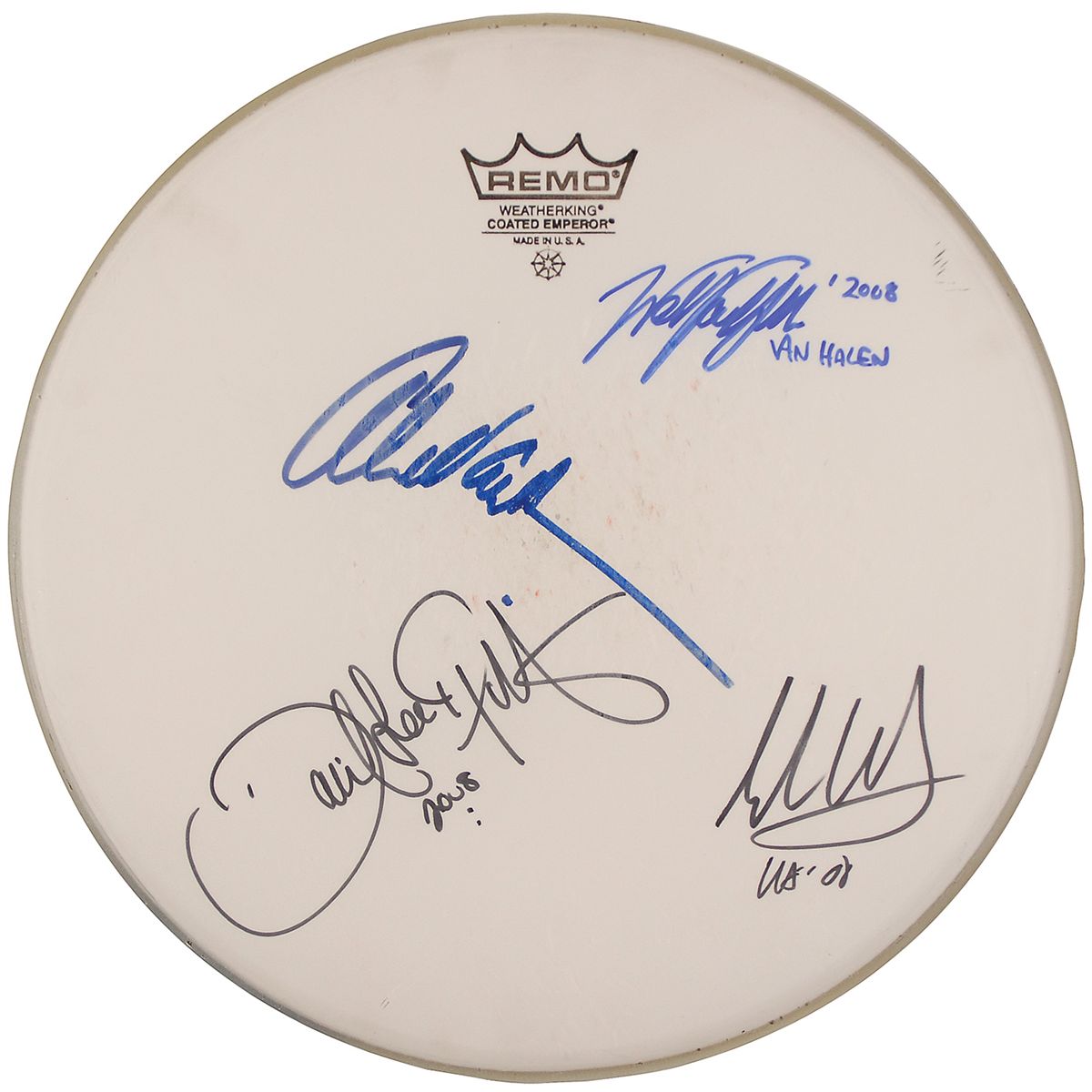 Stage-used 12? coated Remo drumhead, signed in black felt tip by David Lee Roth and Eddie Van Halen, and in blue felt tip by Alex Van Halen and Wolfgang Van Halen. In fine condition, with expected wear from use. Consignor notes drumhead came from the band’s 2008 world tour.