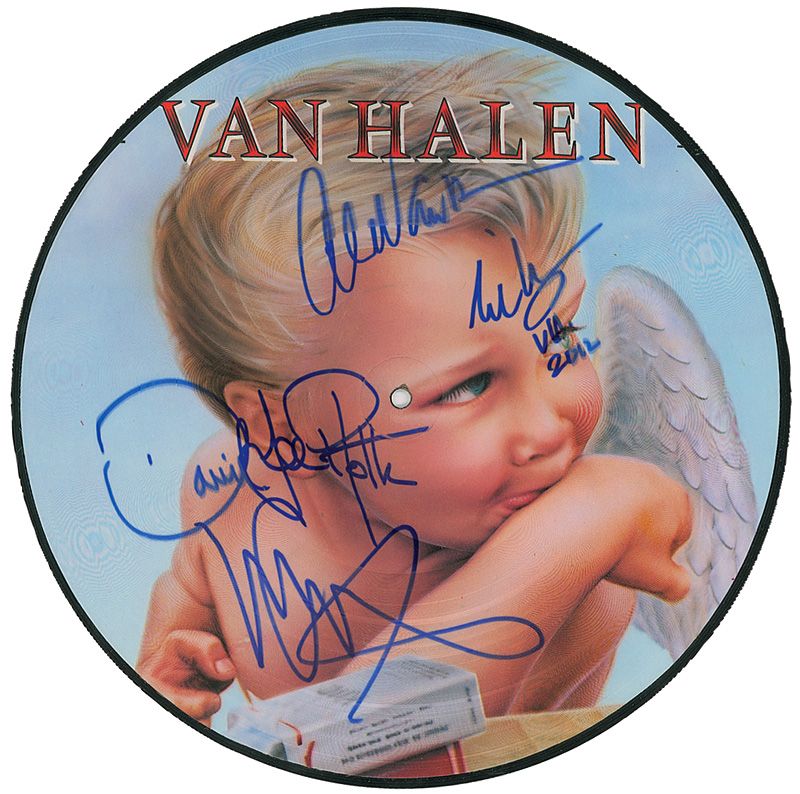 Limited edition 1984 Spanish picture album signed in blue felt tip by Eddie Van Halen, Alex Van Halen, Michael Anthony, and David Lee Roth. In fine condition, with some light haloing to signatures.