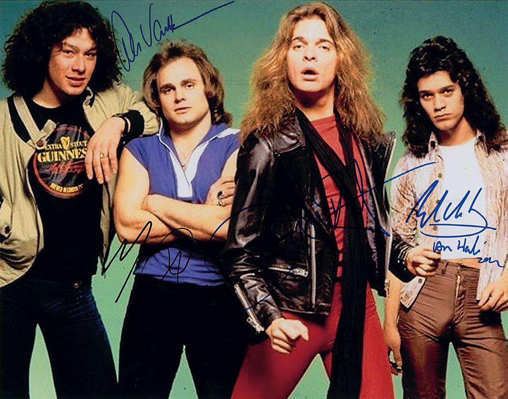 Color satin-finish 14 x 11 group photo, signed in blue felt tip by Eddie Van Halen, Alex Van Halen, and David Lee Roth, and in black felt tip by Michael Anthony. In fine condition, with image a bit grainy and some light contrast to Roth’s and Anthony’s signatures.