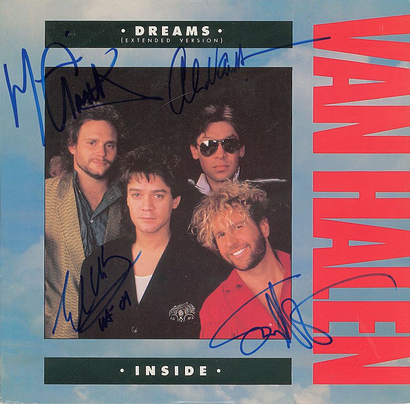 Dreams (Extended Version) 12-inch single signed on the front of the sleeve in blue felt tip by Eddie Van Halen, Alex Van Halen, Sammy Hagar, and Michael Anthony. In fine condition, with some slight spotting and surface impressions. The record is included.