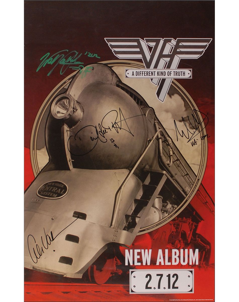 Color 14 x 22 promotional poster for A Different Kind of Truth, signed in black felt tip by Alex Van Halen, David Lee Roth, and Eddie Van Halen, and in green ink by Wolfgang Van Halen. Rolled and in fine condition, with a few scattered light creases and some edge dings.