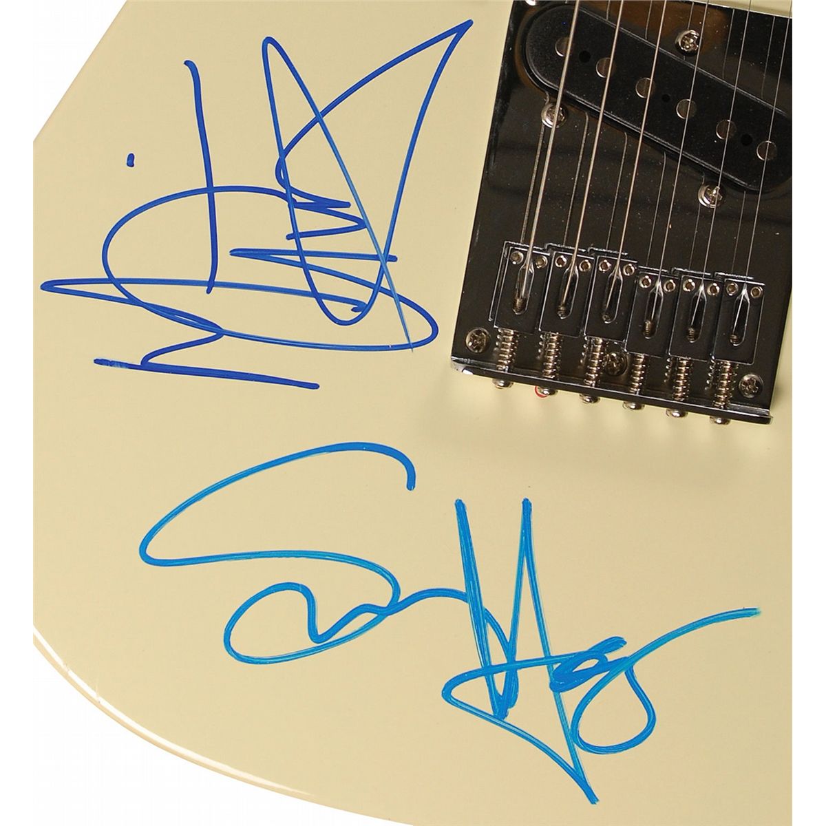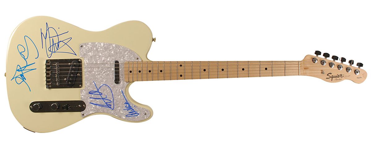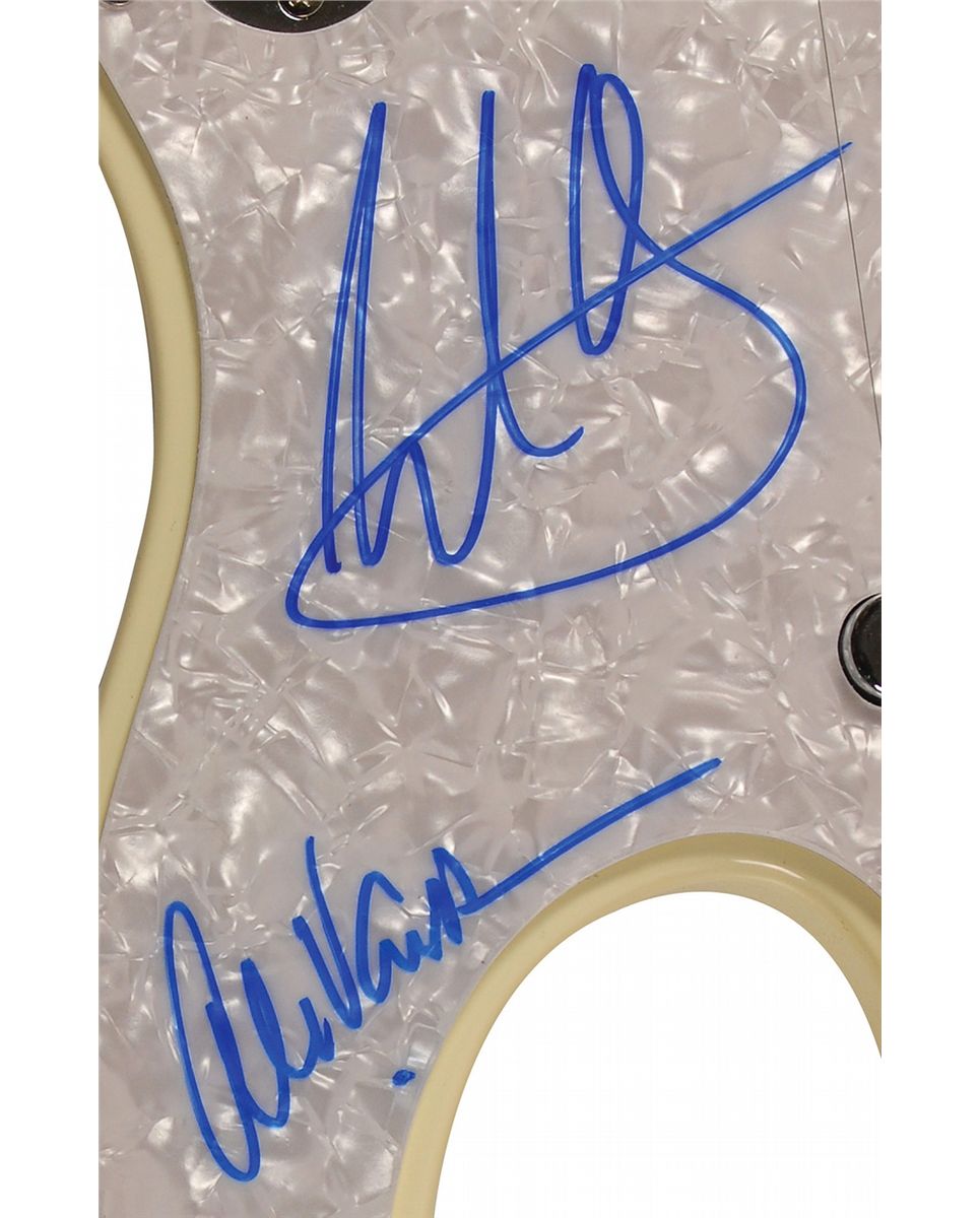 Cream-colored Fender Squier Tele ‘telecaster-style’ electric guitar, signed on the body in blue ink and felt tip by Sammy Hagar and Michael Anthony and in blue felt tip on the pearloid pickguard by Eddie and Alex Van Halen. In fine condition. Oversized.