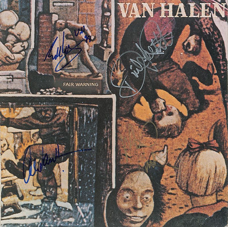 Fair Warning album signed on the front cover in blue felt tip by Eddie and Alex Van Halen, in silver ink by David Lee Roth, and in gold ink by Michael Anthony. In fine condition, with light to moderate contrast to Anthony’s signature. The record is not included. Accompanied by a full letter of authenticity from Roger Epperson/REAL.
