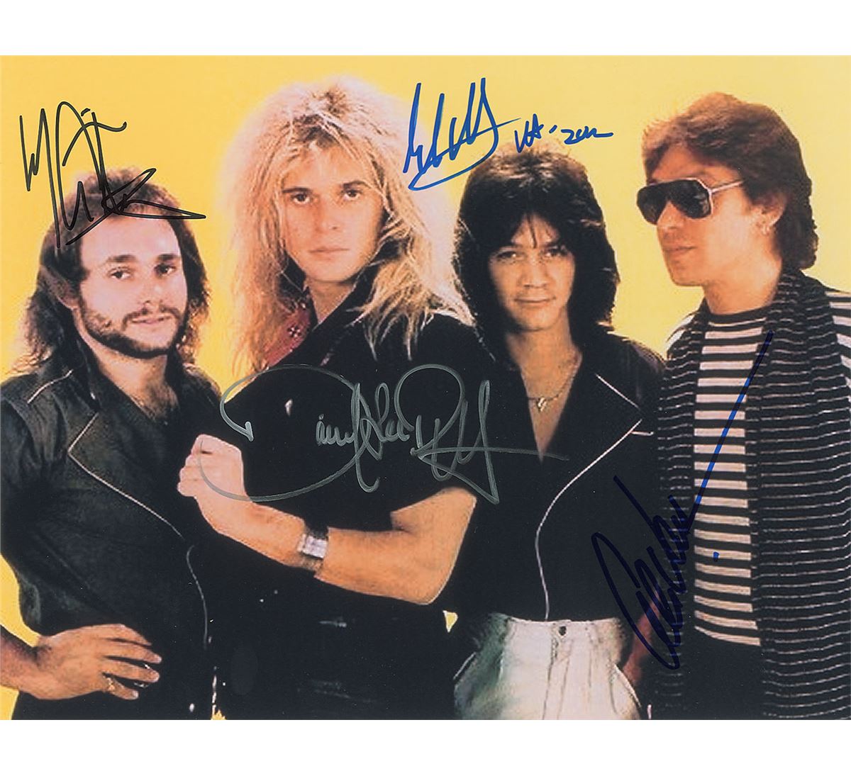 Color satin-finish 14 x 11 photo of the original Van Halen line-up, signed in blue felt tip by Eddie and Alex Van Halen, in silver ink by David Lee Roth, and in black felt tip by Michael Anthony. In fine condition, with fair contrast to Alex’s signature and a slightly grainy quality to the image. Accompanied by a full letter of authenticity from REAL.