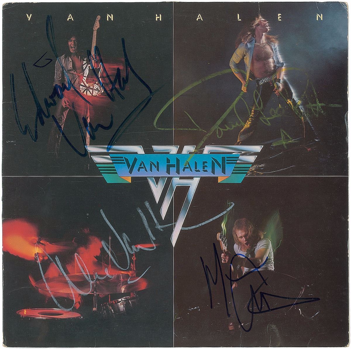 Self-titled debut album signed on the front cover in grease pencil and felt tip, “Edward Van Halen,” “David Lee Roth,” “Alex Van Halen,” and “Michael Anthony.” In fine condition. The record is not included. Accompanied by a full letter of authenticity from REAL.