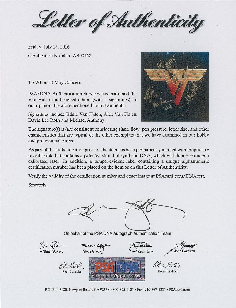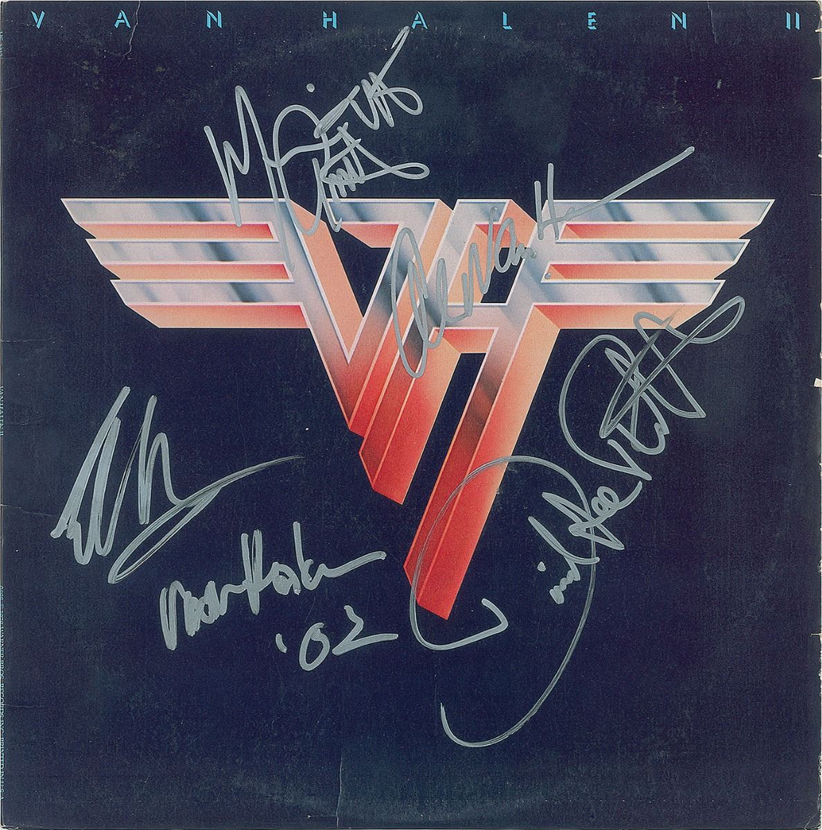 Van Halen II album signed on the front cover in silver ink, “Eddie Van Halen, ‘02,” “Michael Anthony, VH,” “Alex Van Halen,” and “David Lee Roth.” In fine condition. The record is included. Accompanied by a full letter of authenticity from PSA/DNA.