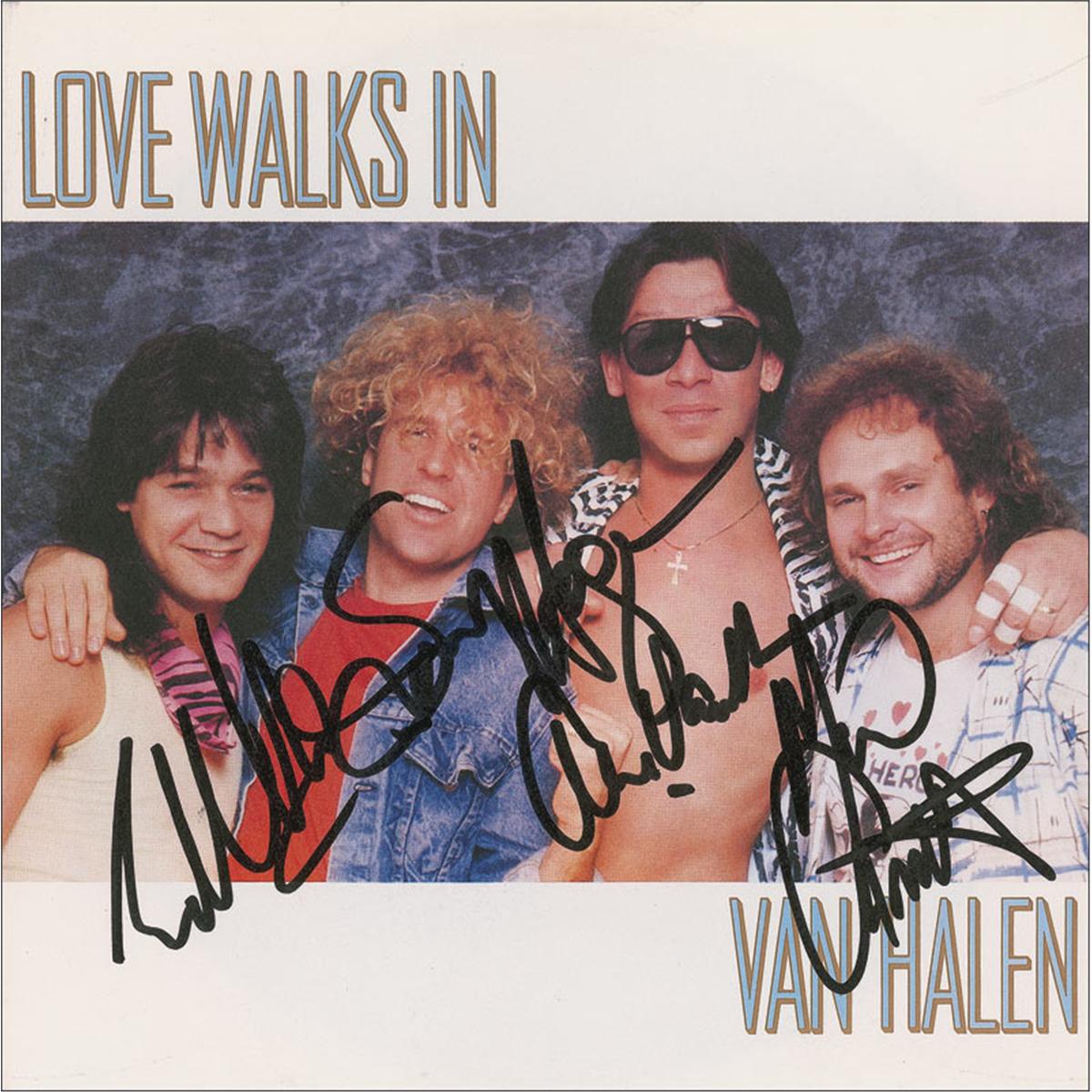 45 rpm record sleeve for ‘Love Walks In,’ signed in black felt tip by Eddie Van Halen, Alex Van Halen, Sammy Hagar, and Michael Anthony. In fine condition. The record is included.