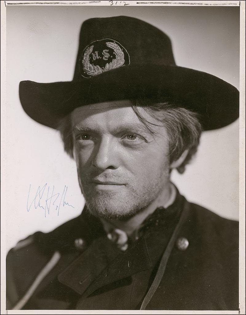 Vintage semi-glossy 10 x 12.75 publicity photo of Heflin as a Civil War general in Tennessee Johnson, signed in blue ballpoint “Van Heflin.” In very good condition with scattered bends and creases with some affecting his facial area, editorial notations at the extreme edges, areas of soiling, and irregular ink flow to some of the letters in his name.