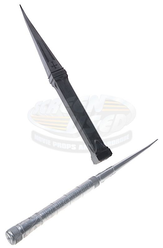 (Universal Pictures, 2004) This set of prop stakes includes a large silver stunt stake that features simulated engravings the entire length. Made of hard rubber this stake measures 22.75" long. The second is a large stunt stake made of rubber and detailed to look like carved wood. Measuring 23" long, this stake is an unpainted back-up not used during filming.