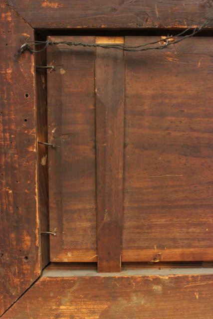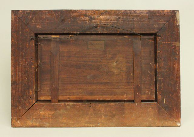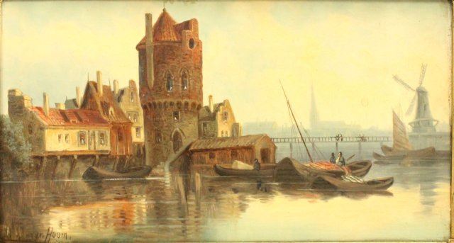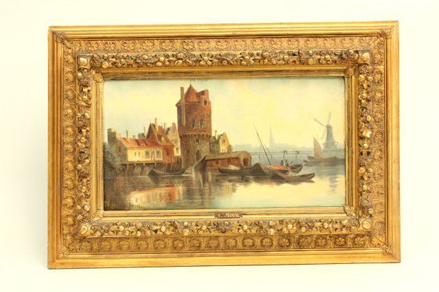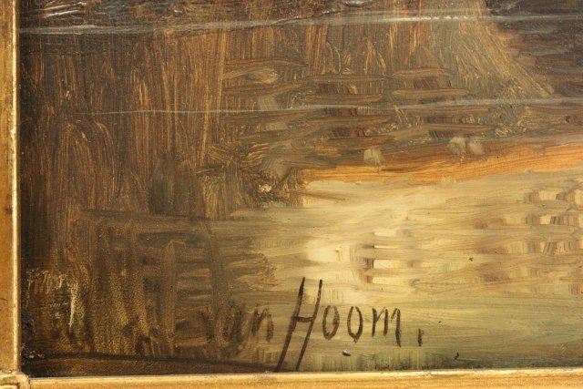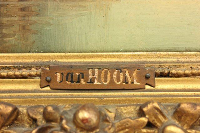 Oil on board. Carved gilt frame. Signed Van Hoom. Approx. 10" x 18.5" unframed, 18.5" H x 27" W framed. Chips to frame.