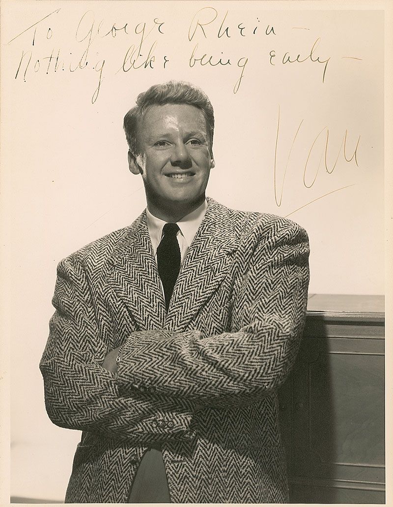 Vintage matte-finish 10 x 12.75 photo, signed and inscribed in fountain pen to assistant director George Rhein, “To George Rhein—Nothing like being early—Van.” In fine condition, with light edge rippling, some light skipping to inscription, and signature and inscription a shade light.