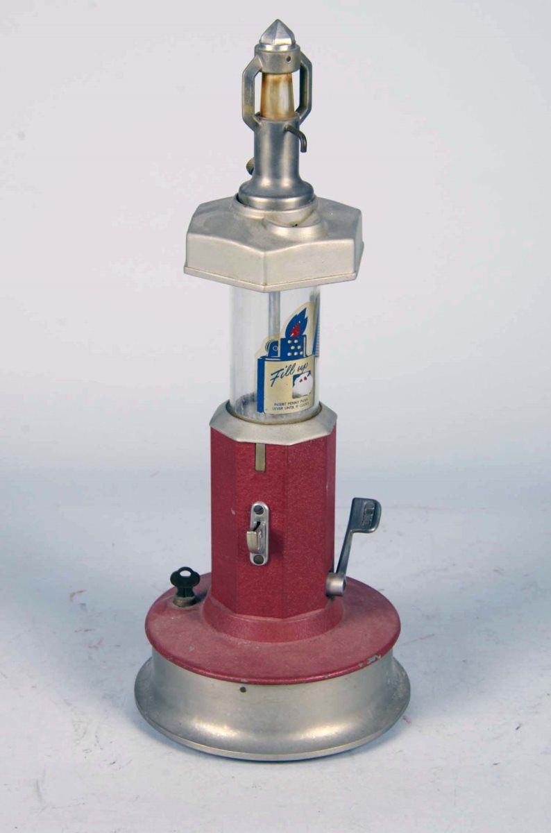 Tall counter top 1 ¢ Coin op dispenser by Arthur Kautz of Lockport NY. To refill cigarette lighters. Made to look like gas pumps of the day. Plated not painted, with Key. Pat. 1897154 Circa 1930's. Condition Very Good Size 7" x 7" x 19".