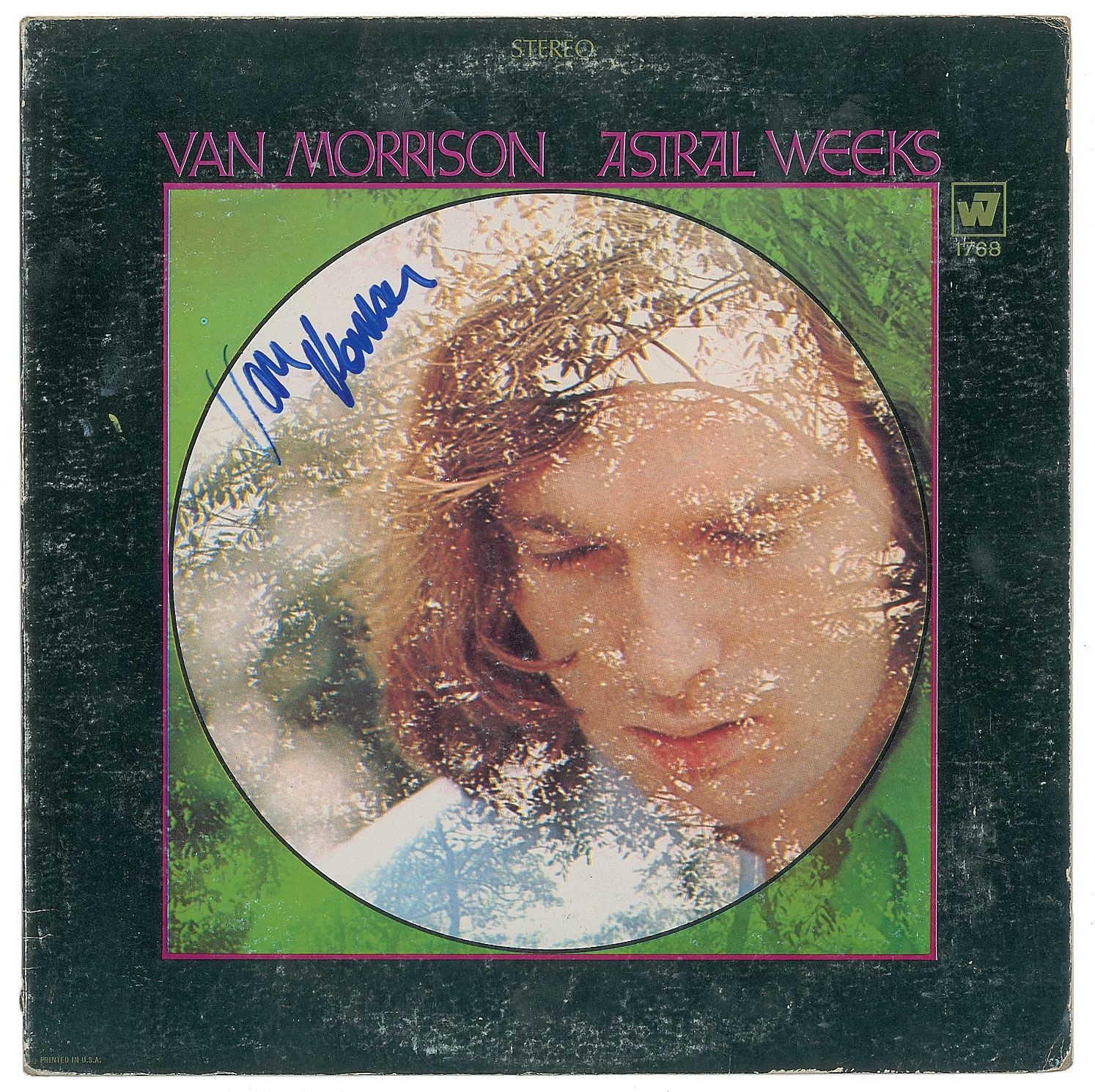 Astral Weeks album signed on the front cover in blue felt tip by Van Morrison. In very good to fine condition, with moderate scuffing and splitting along the top edge. The record is not included.
