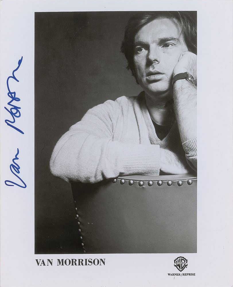 Glossy 8 x 10 Warner/Reprise publicity photo of Morrison resting on a chair, signed vertically in blue felt tip. In fine condition, with some scattered surface marks, which do not affect image or signature. Originally obtained by in-person specialist Mike Wehrmann.