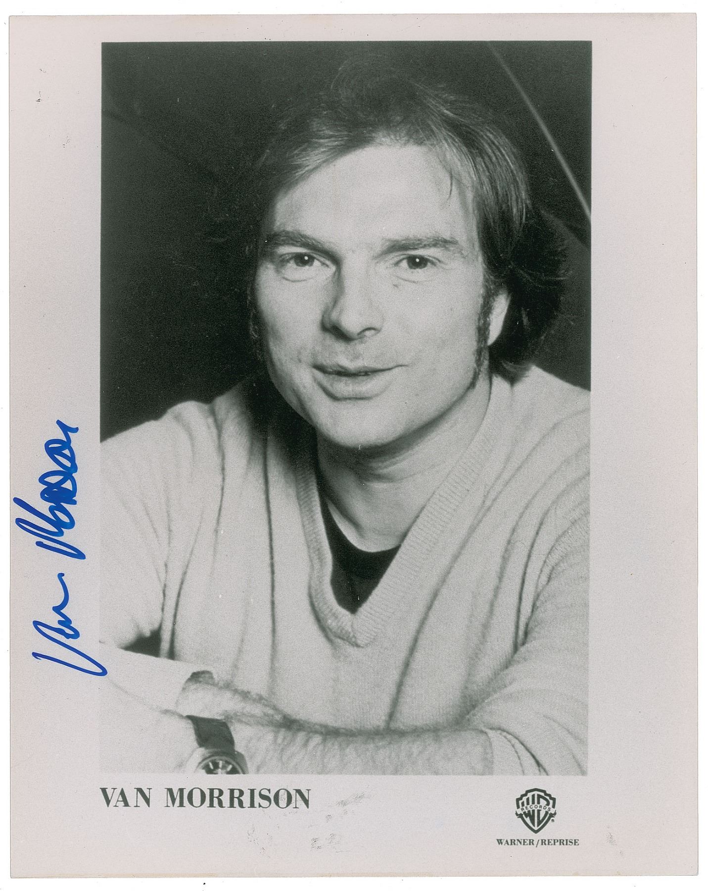 Glossy 8 x 10 reprint of a Warner Bros. publicity photo of Van Morrison, signed in the left margin in blue felt tip. In fine condition. Originally obtained by in-person specialist Mike Wehrmann.