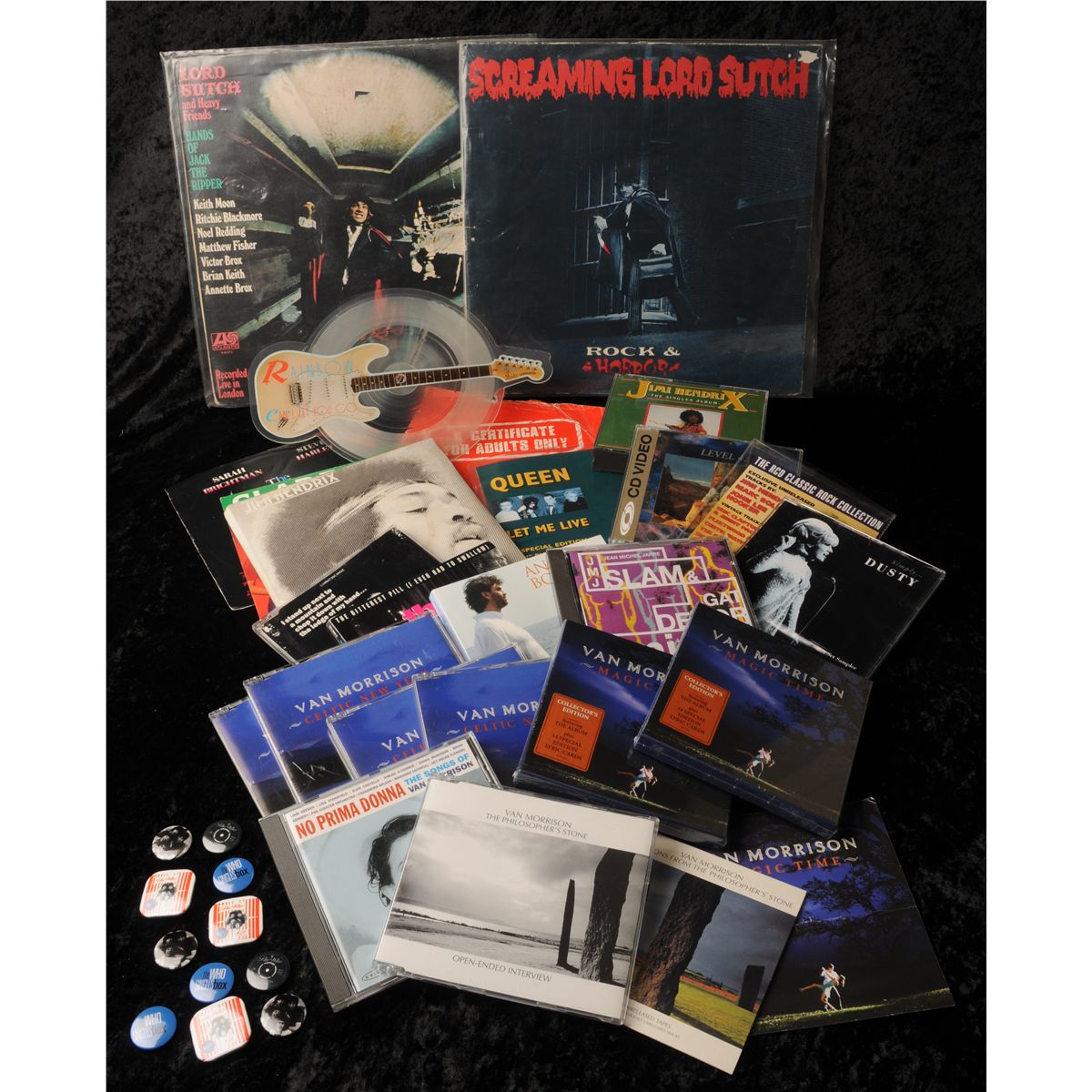 Anniversary Limited Edition The Jam In The City singles together with two Screaming Lord Sutch LPs, Rainbow shaped 45, Queen & Jimi Hendrix 45s and Who Singles box promo badges (QTY)