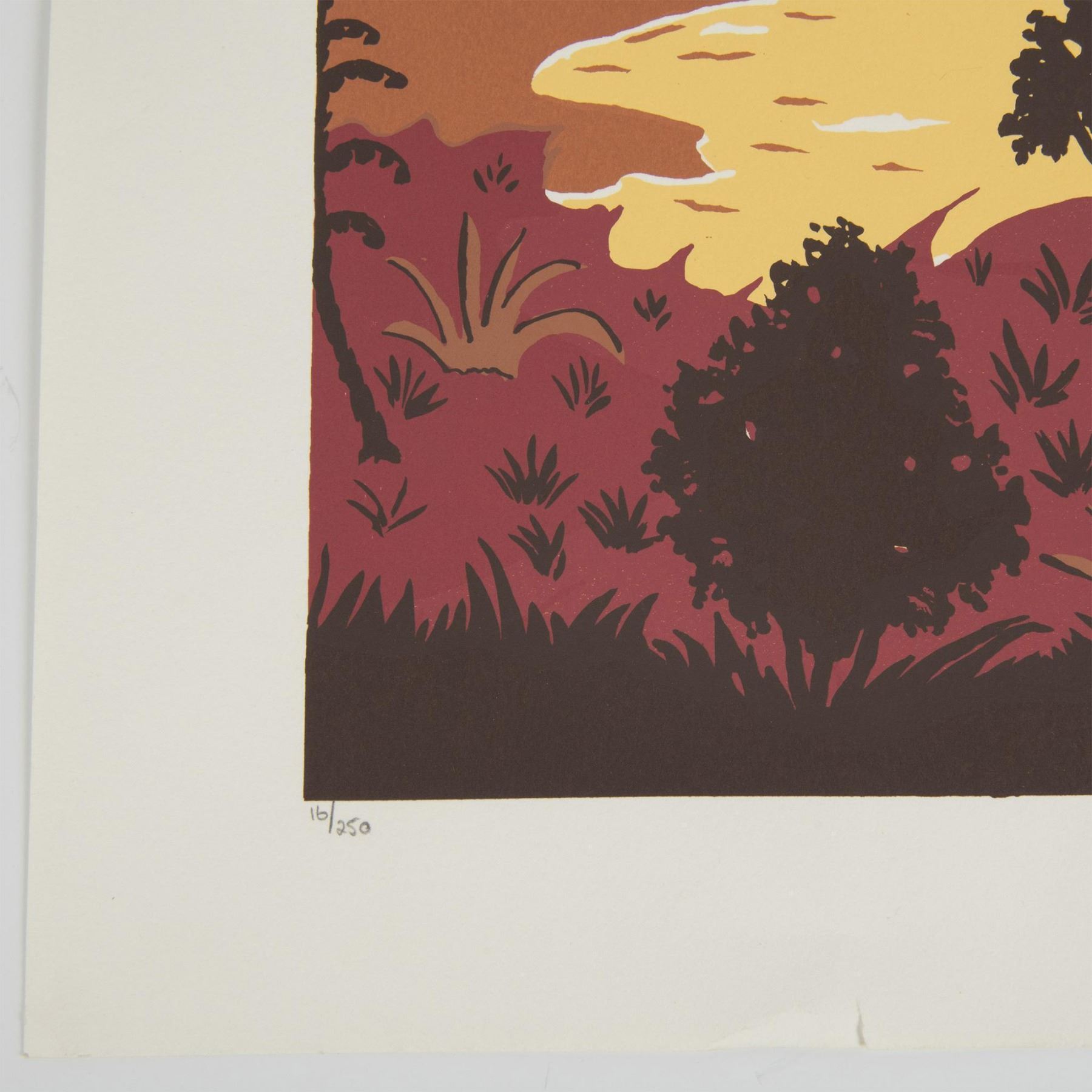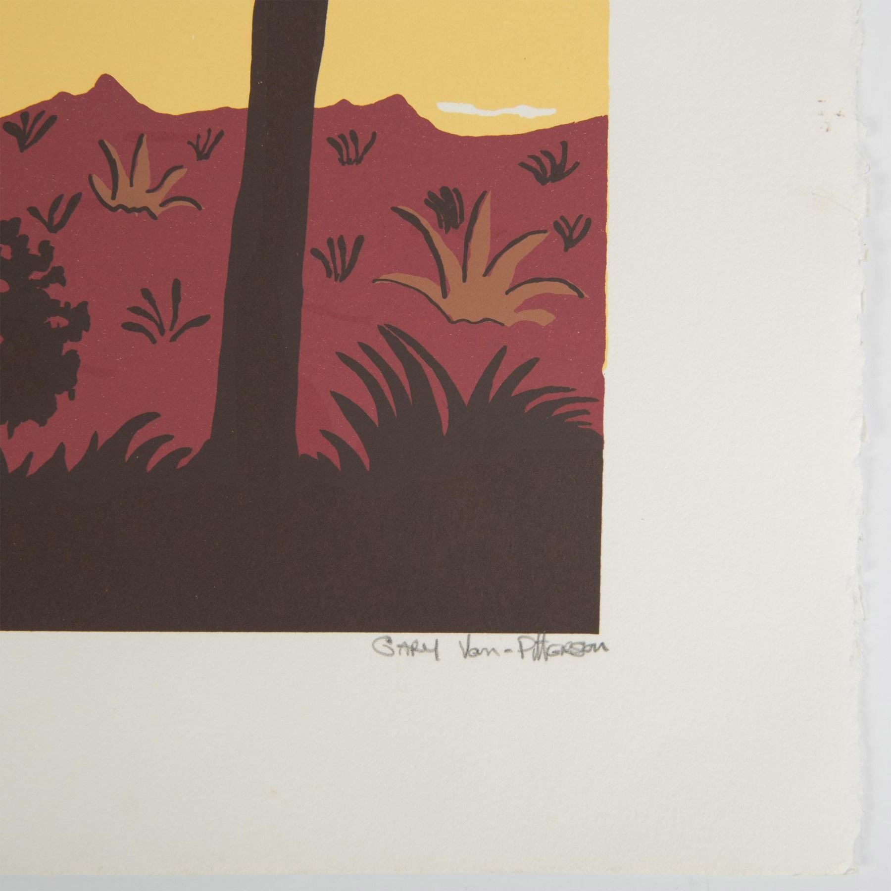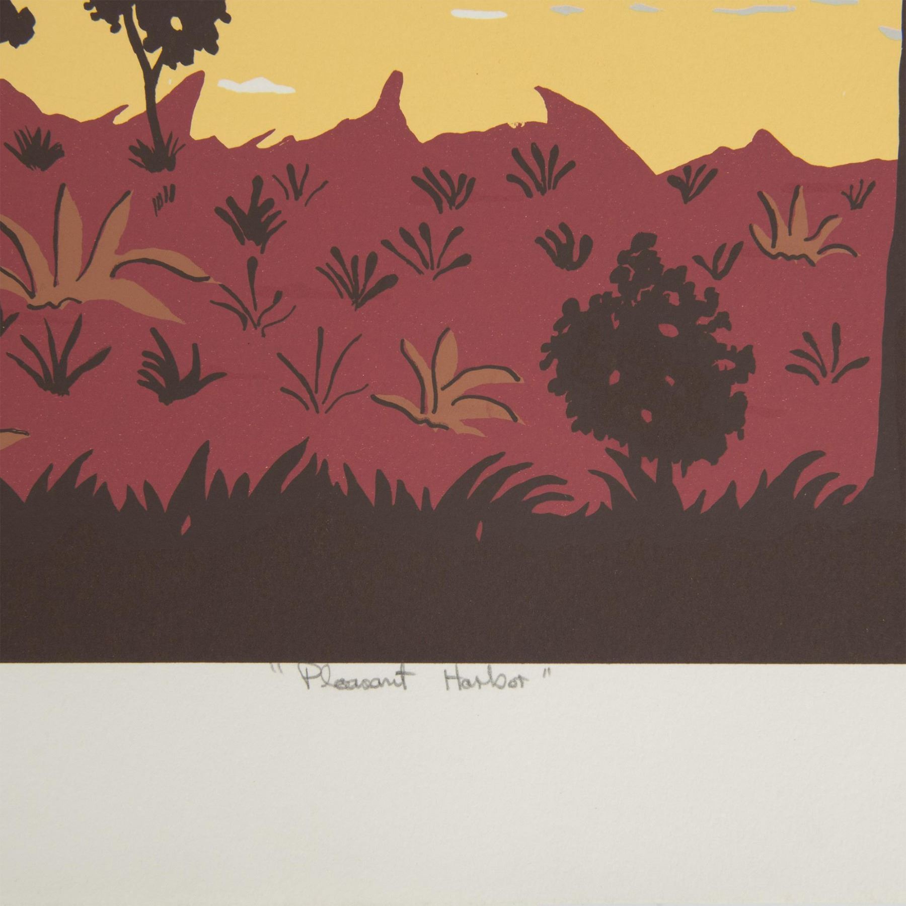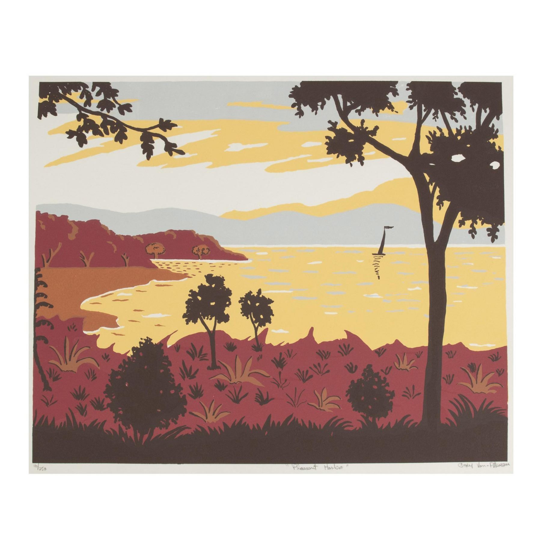 A vintage original serigraph in colors on paper of a lovely landscape by Jamaican artist Lloyd Van Pitterson entitled Pleasant Harbor. Edition number in graphite on lower left: 16/250. Artists pseudonym signature on lower right: Gary Van Pitterson.