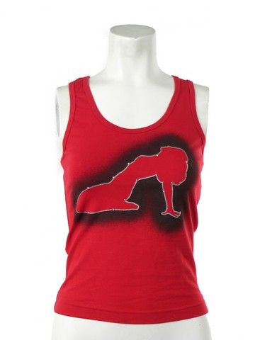 Red tank top with girl silhouette and rhinestone design used in "Van Wilder" (2002); inside tag reads "12/27/01. Tal-. 7095". Comes with COA.