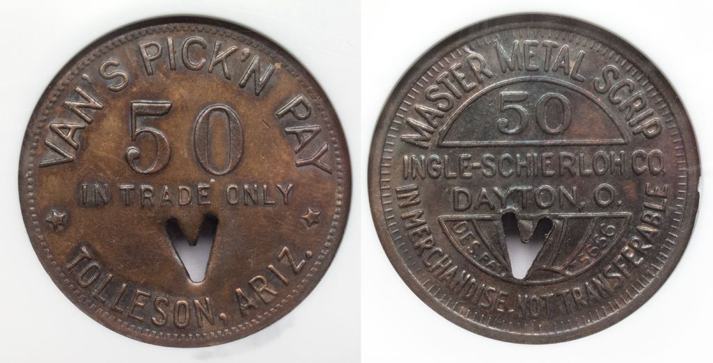 AU 58. R9. Van's Pick'n Pay / GF 50c IT only // Master Metal Scrip / 25c / Ingle-Schierloh Co / Dayton, O. 'V' cut out.City: TollesonCounty: MaricopaState: AZDate: