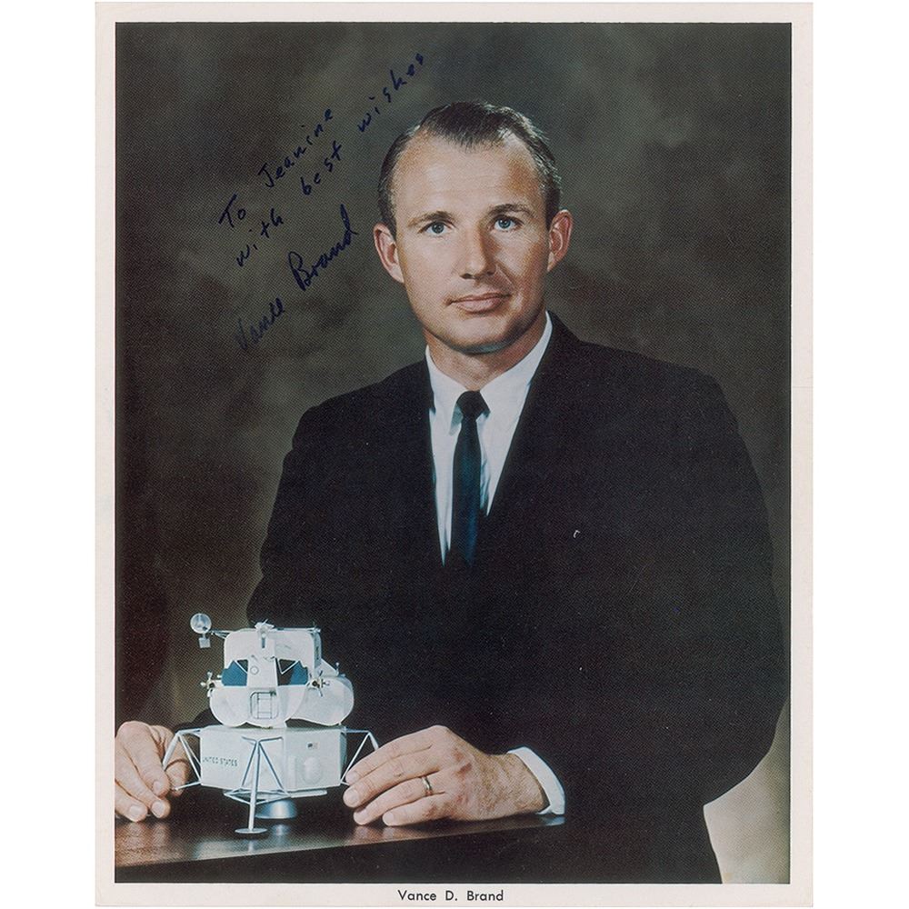 Official color 8 x 10 NASA lithograph of Brand posing with a model of a lunar module, signed and inscribed in black felt tip, "To Jeanine, with best wishes, Vance Brand.” In very fine condition. Recipient was an employee at the Los Angeles International Airport who assisted astronauts with picking up their GSA vehicles circa 1967.