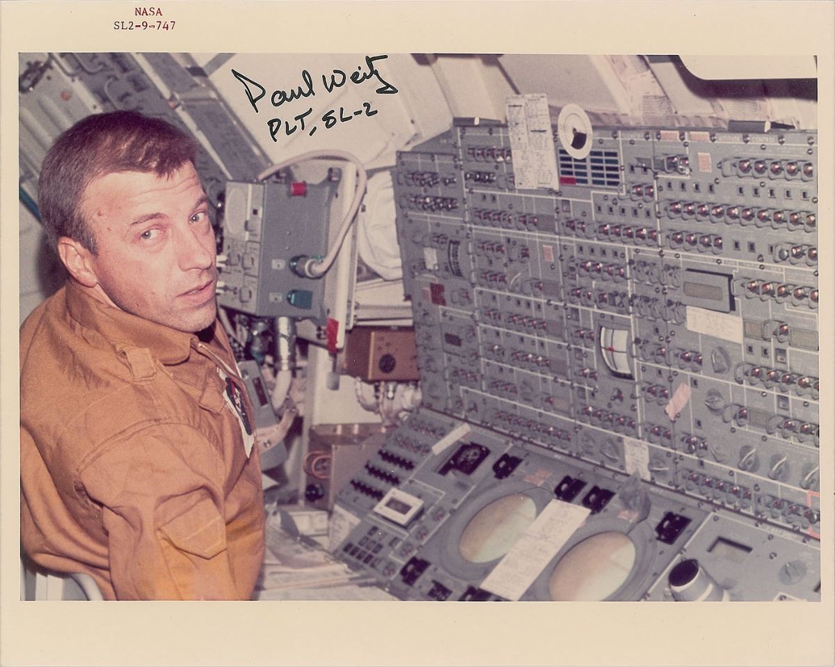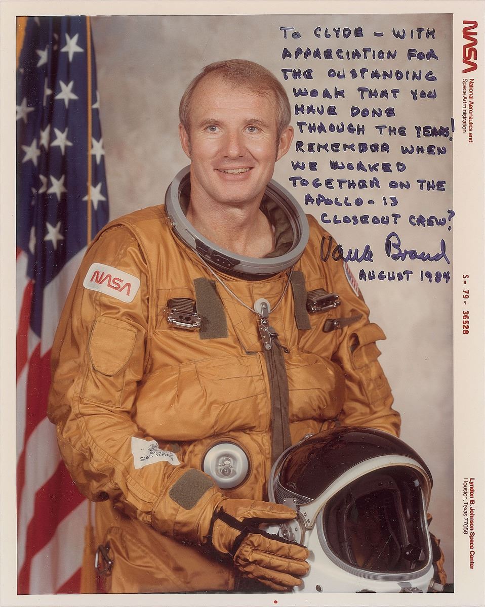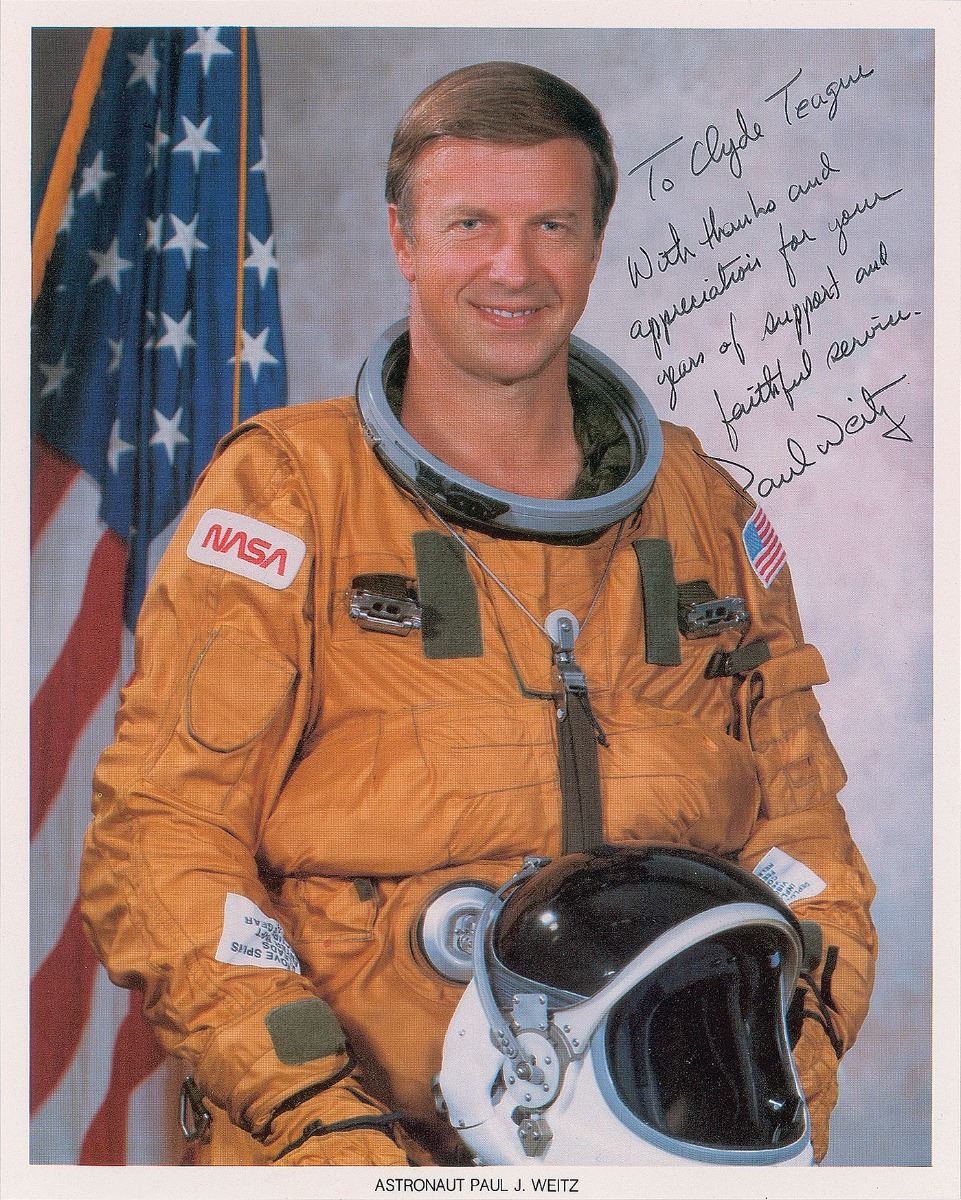 Three photos: an official color semi-glossy 8 x 10 red-numbered NASA photo of Vance Brand posing in his space suit, signed and inscribed in black felt tip, “To Clyde—with appreciation for the outstanding work that you have done through the years! Remember when we worked together on the Apollo–13 closeout crew? Vance Brand, August 1984”; an official color 8 x 10 NASA lithograph of Paul Weitz posing in his space suit, signed and inscribed in black ink, “To Clyde Teague, with thanks and appreciation for your years of support and faithful service, Paul Weitz”; and an official color semi-glossy 10 x 8 red-numbered NASA photo of Weitz in front of a large control panel, signed in black felt tip, “Paul Weitz, PLT, SL–2.” In overall fine condition. Clyde Teague served as a NASA suit technician during the Gemini and Apollo programs.