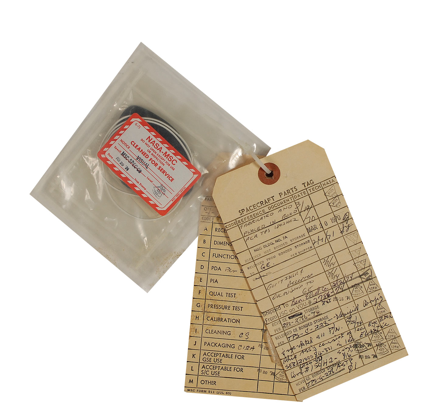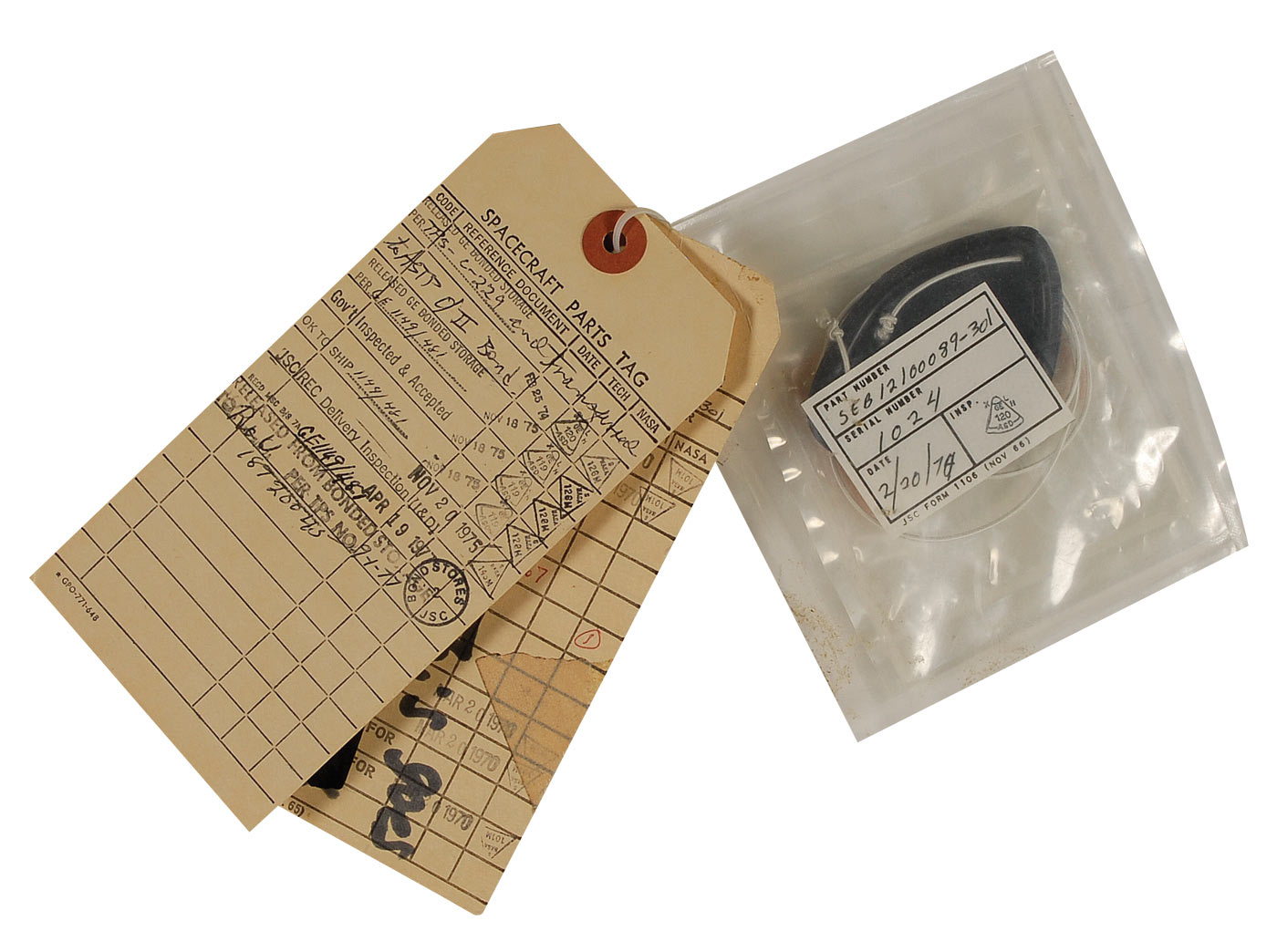 Flight-flown black eye patch, 2.5 x 2, used by Vance Brand when star sightings were conducted with the Apollo Guidance and Navigation system. The patch is sealed within a plastic pouch and serial-numbered SEB12100089-301. The bag in turn is attached via a plastic fastener to two NASA parts tags, each labeled “Spacecraft Parts Tag” and authenticating the item’s history.