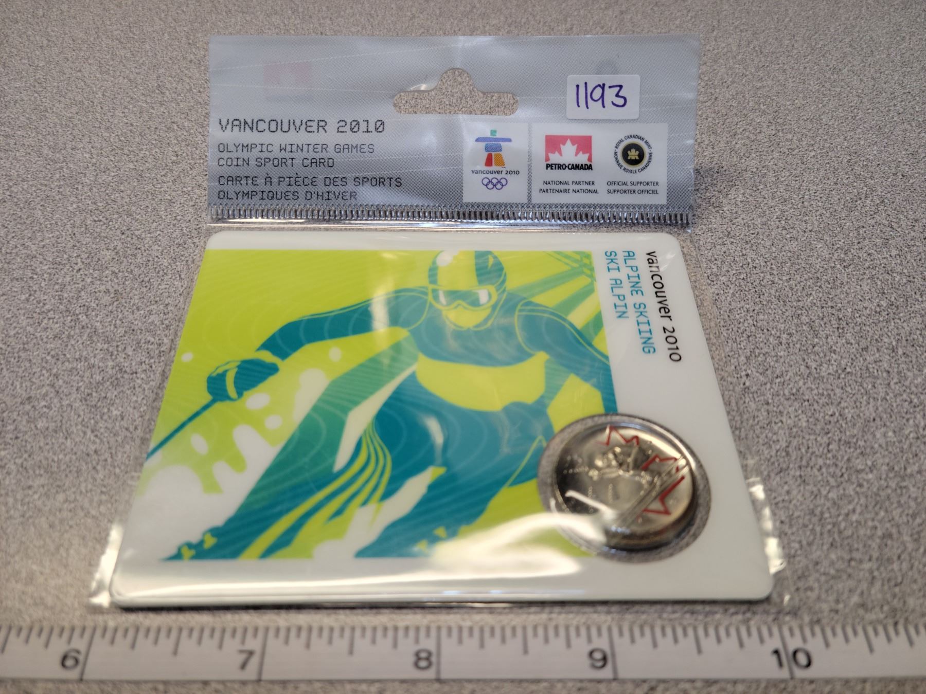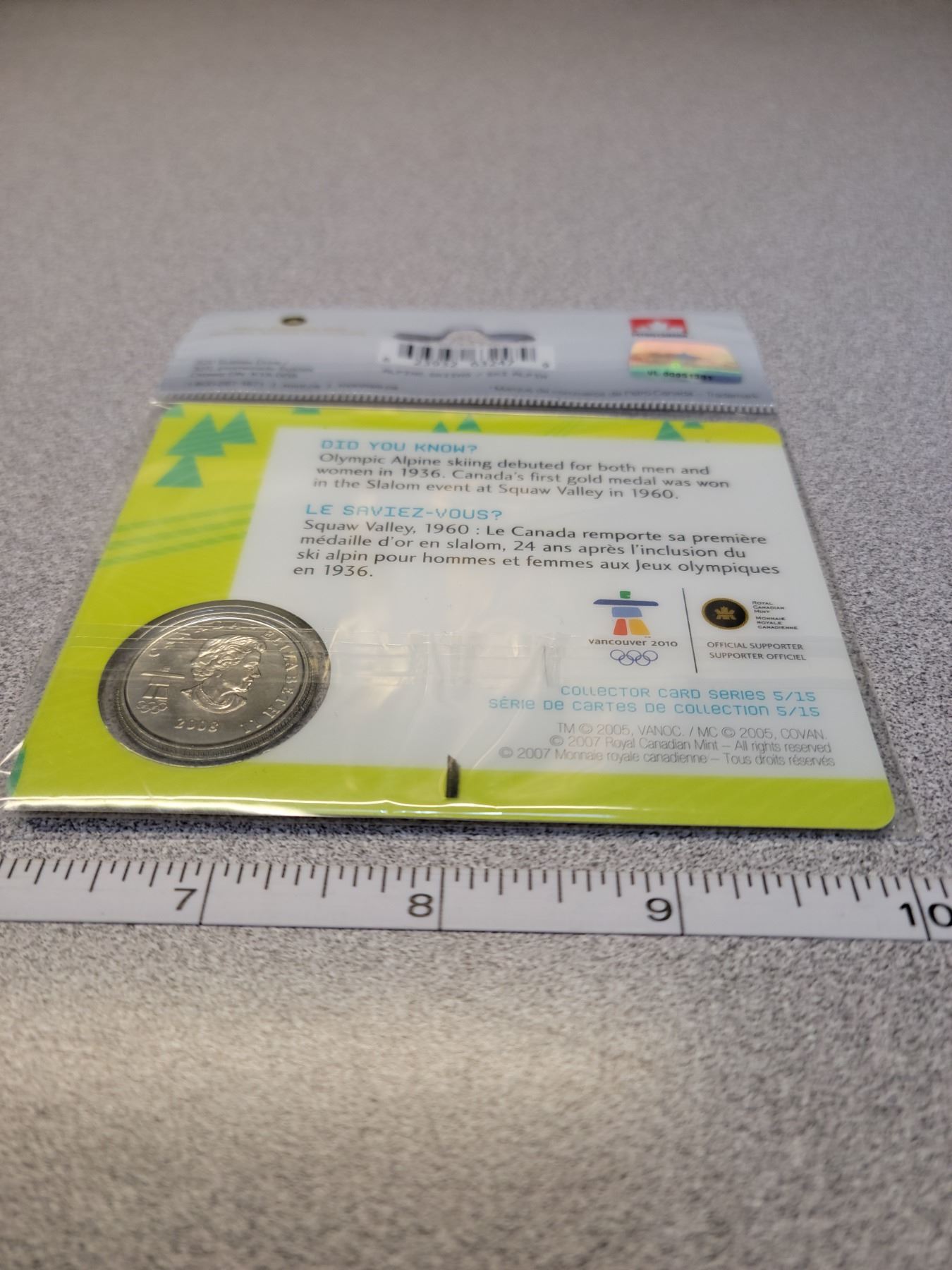 Vancouver 2010 Olympic Winter Games Sport Card featuring Alpine Skiing Encased 25 Cents Collector Card. Has Painted Reverse and is dated 2008. Mintage of 40,470.