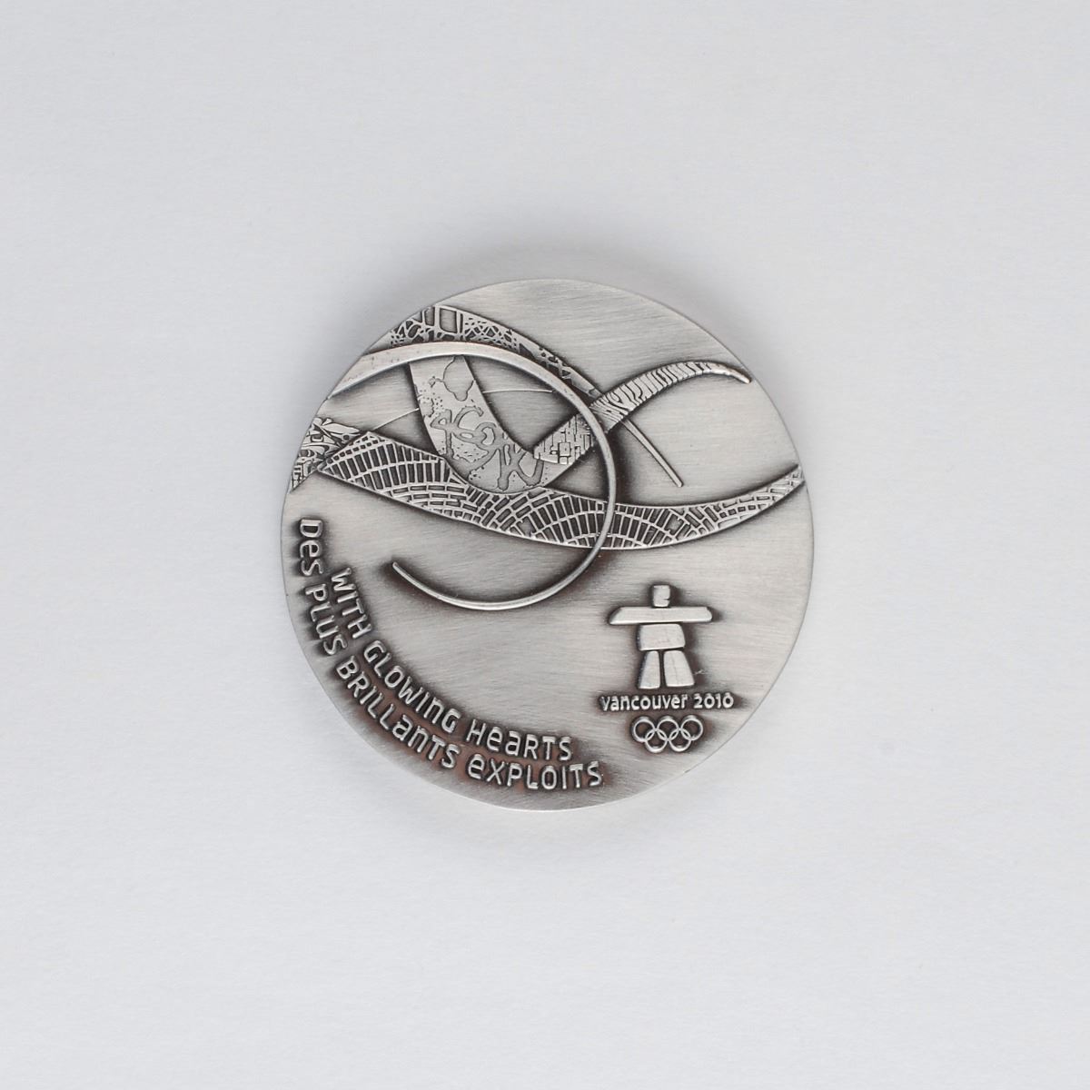 Athlete’s participation medal issued for the Vancouver 2010 Winter Olympics. Silvered, 60 mm, 89 gm. The front depicts a unique orca design and the Olympic rings; the reverse bears the Winter Games emblem, graphics inspired by Canada’s natural and cultural diversity, and a raised motto, “With glowing hearts, des plus brillants exploits.” Complete with original case.
