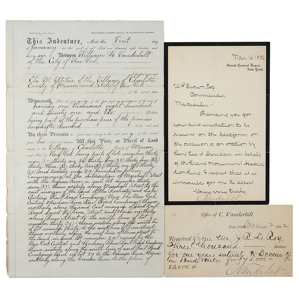 Three documents signed by noted members of the prominent Vanderbilt family, including: an indenture signed by William H. Vanderbilt, "W. H. Vanderbilt," three pages on two adjoining sheets, January 1, 1876, for the purchase of land in Charlotte, New York; an LS signed by Cornelius Vanderbilt II, "C. Vanderbilt," one page, March 16, 1886, declining an invitation to "an oration by Gen'l Geo. A. Sheridan in behalf of the Grant Monument Association Fund"; and a receipt from the office of Cornelius Vanderbilt II, signed "C. Vanderbilt," December 2, 1892, for the sum of $3000. In overall very good to fine condition, with small tape repairs to edge splits on the indenture.