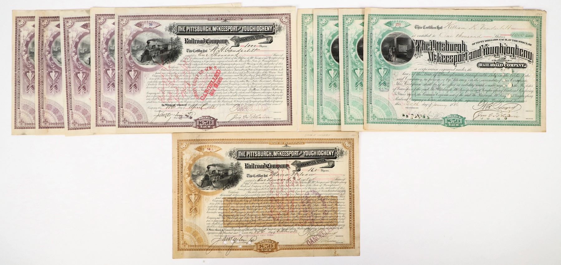 Group of 10 stocks either issued to or signed by members of the famous Vanderbilt family. All are Pittsburgh, McKeesport & Youghiogheny Railroad Company, issued 1882-1886. Issued to WH Vanderbilt (7), one issued to William K. Vanderbilt, and one other stock not issued to a Vanderbilt but signed by CW Vanderbilt on the reverse. The Vanderbilt family rose to prominence in the 19th century through the efforts of Cornelius "Commodore" Vanderbilt, who built a vast fortune in shipping and railroad industries, becoming one of America's wealthiest individuals. Their wealth and influence expanded through the construction of major railroads, including the New York Central, and through lavish displays of Gilded Age opulence, such as grand mansions in New York and Newport. By the end of the century, the Vanderbilts were a symbol of both immense industrial success and the excesses of America's emerging aristocratic elite.