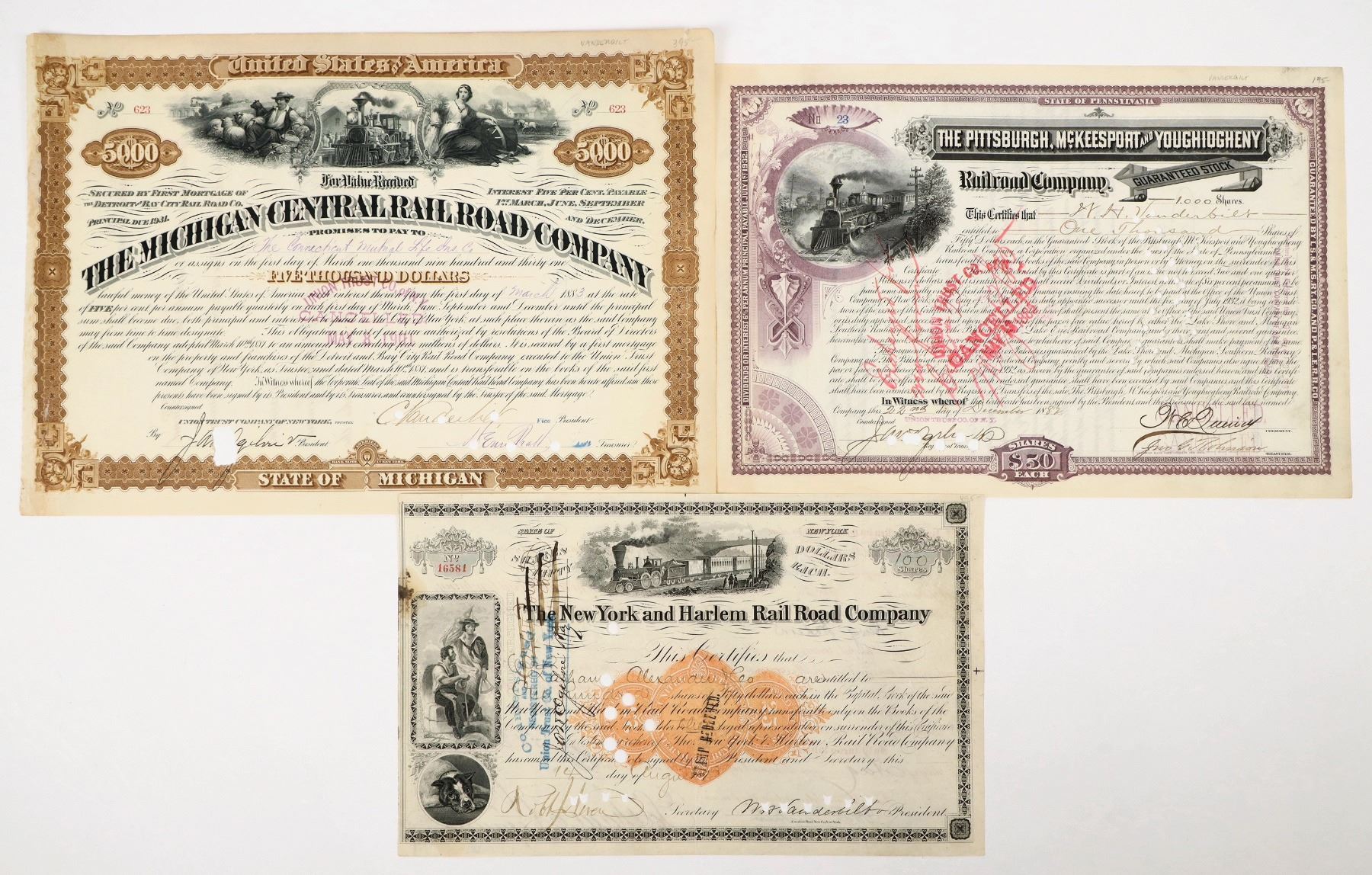 Lot of 3 different. 1) New York & Harlem Railroad Co. issued in 1873, signed by WH Vanderbilt (son of Cornelius), punch cancelled, with rare RN-U imprinted revenue. 2) Pittsburgh, McKeesport & Youghiogheny stock issued to WH Vanderbilt, 1882. Punch cancelled. 3) Michigan Central Railroad Company bond issued in 1883, signed by C. Vanderbilt as vice president. Punch cancelled. The Vanderbilt family rose to prominence in the 19th century through the efforts of Cornelius "Commodore" Vanderbilt, who built a vast fortune in shipping and railroad industries, becoming one of America's wealthiest individuals. Their wealth and influence expanded through the construction of major railroads, including the New York Central, and through lavish displays of Gilded Age opulence, such as grand mansions in New York and Newport. By the end of the century, the Vanderbilts were a symbol of both immense industrial success and the excesses of America's emerging aristocratic elite.