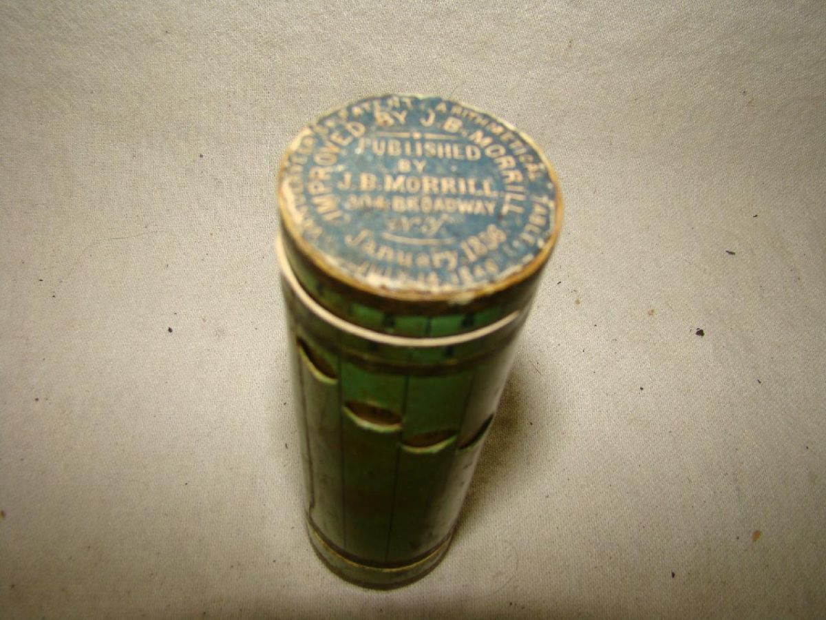 Extremely rare example of "VANDERVER'S PATENT ARITHMETICAL IMPROVED BY J.B. MORRILL" Paper-covered cylinder. Patents: July 14, 1846 and January, 1856. 4.75"