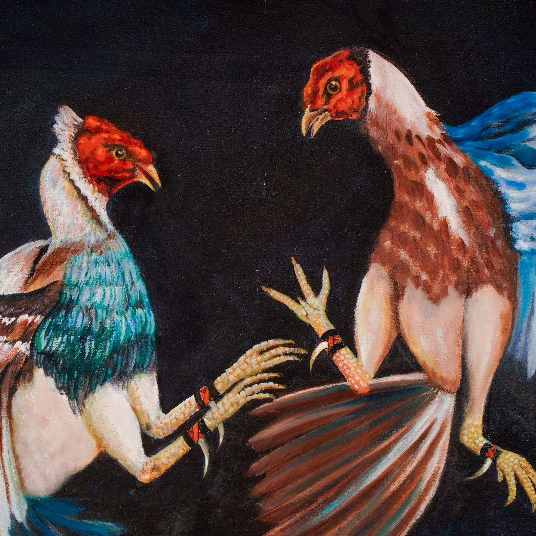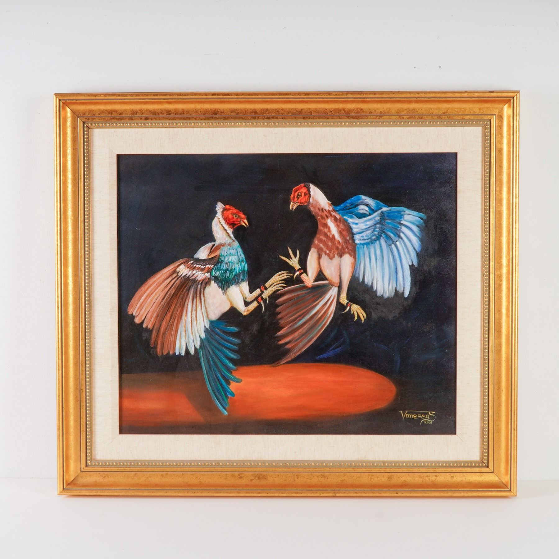 Vanessa S., Oil on Canvas Painting, Cockfight Scene, Signed