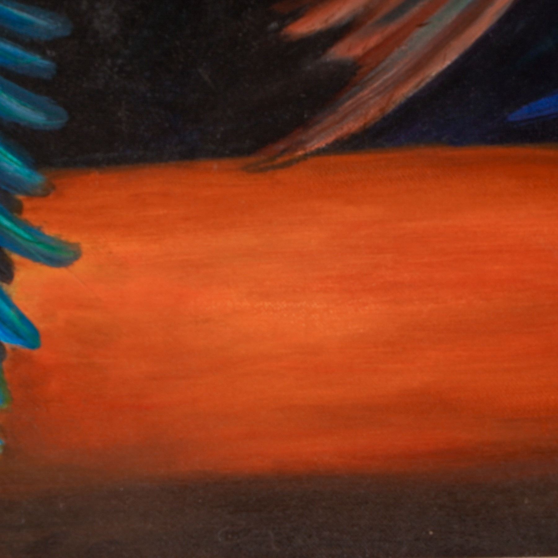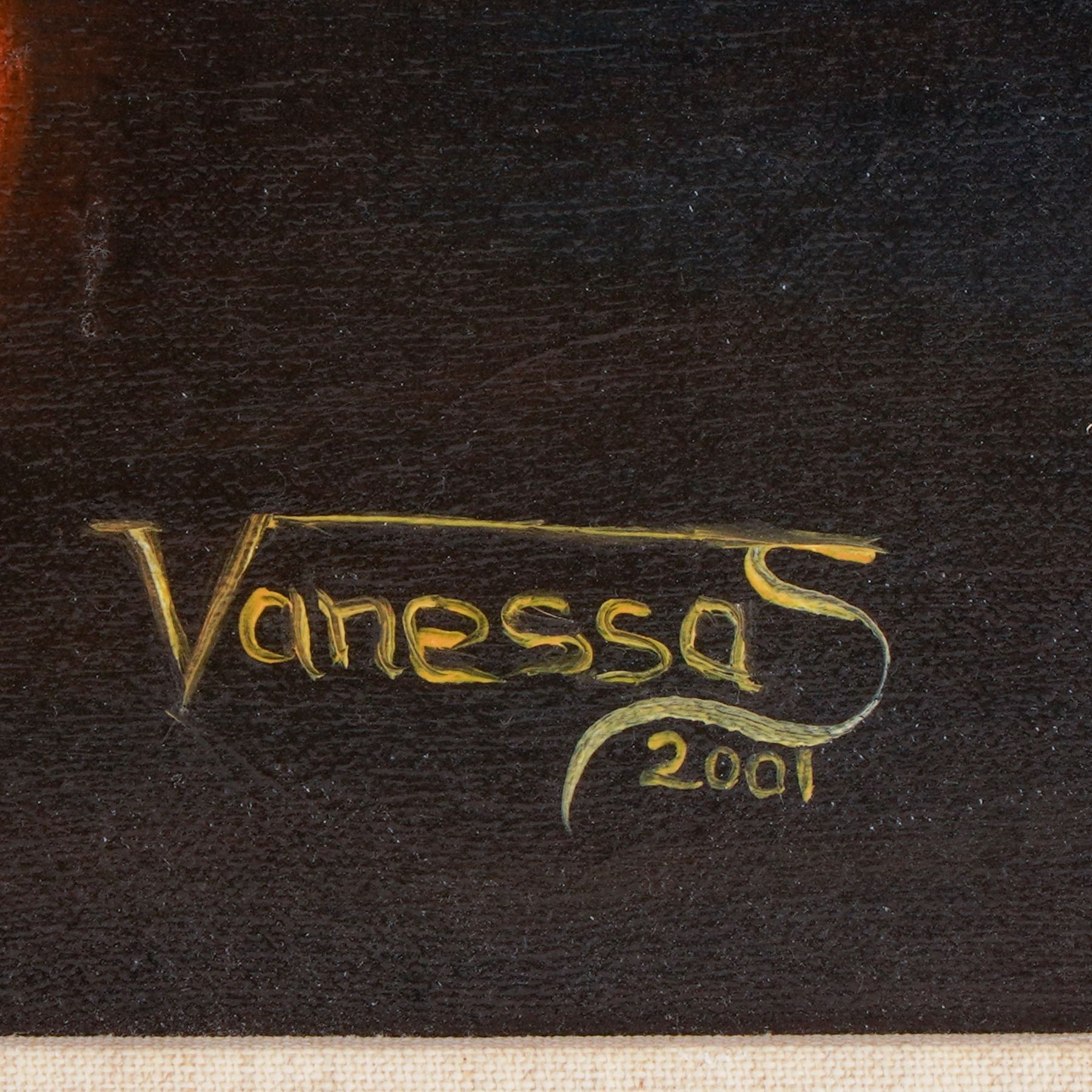 A dynamic and vividly rendered oil painting by Vanessa S., dated 2001, capturing the raw energy and movement of two gamecocks mid-battle. The artist's expressive brushwork and mastery of color bring life to the plumage of the dueling birds, one with iridescent teal and chestnut feathers, the other with warm russet tones and sweeping blue wings, set against a deep, dramatic background. The composition's tension and balance are heightened by the rich contrast of the earthy orange ground beneath the birds, suggesting a symbolic or traditional arena. A striking work of figurative realism imbued with motion and cultural resonance. Signed and dated lower right, the piece is presented in a finely gilt wood frame with a linen liner.