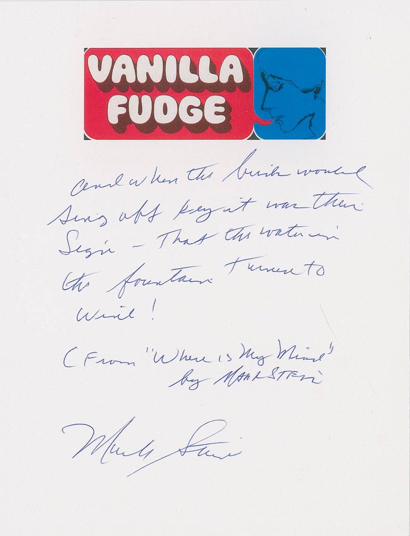 Souvenir handwritten lyrics to the beginning of the second verse of ‘Where Is My Mind,’ written out by Stein on an off-white 8.5 x 11 sheet, signed at the conclusion by Stein, and signed again in the handwritten credit. In fine condition, with a light crease to lower right corner.