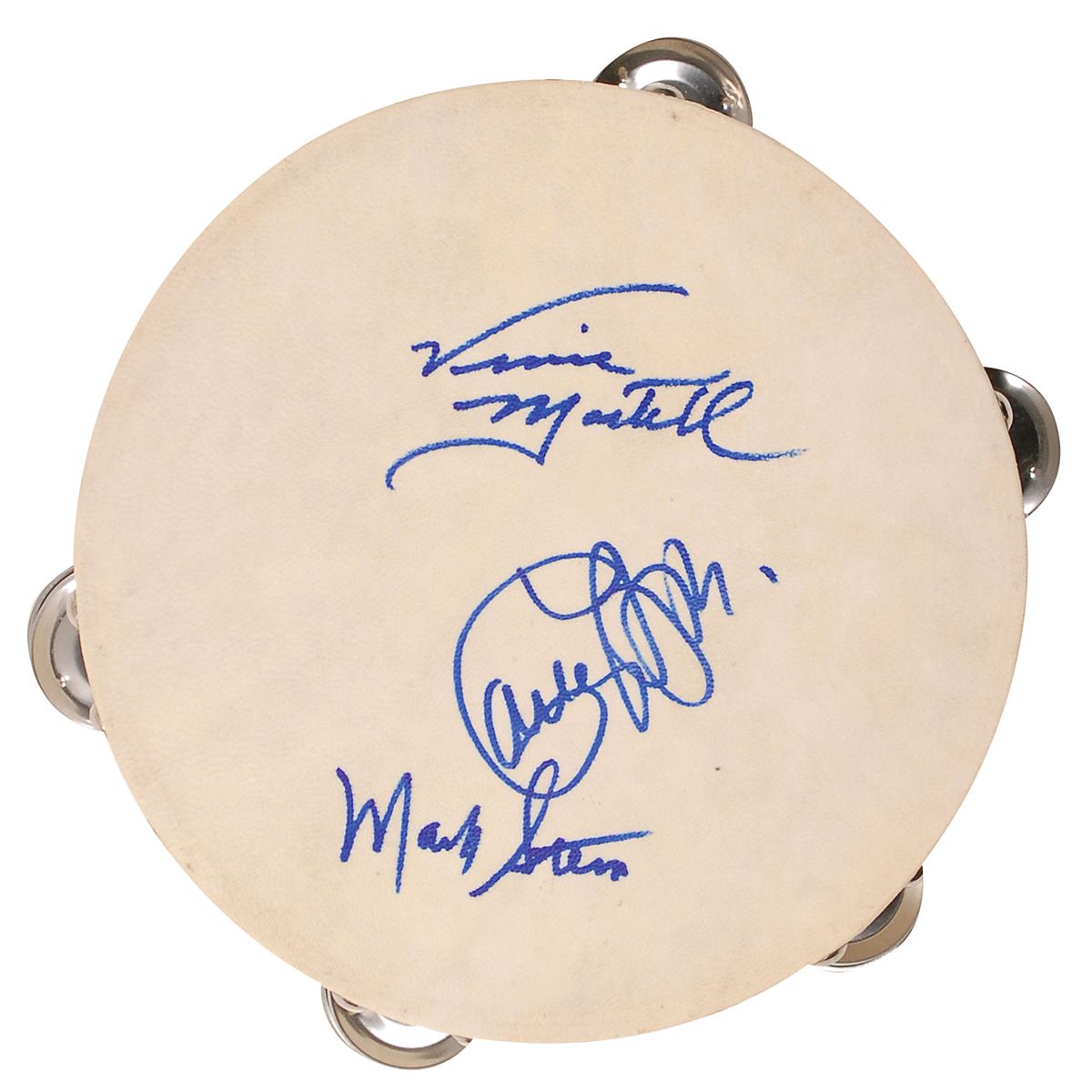 Off-white 8? tambourine, signed on the head in blue felt tip by Mark Stein, Carmine Appice, and Vince Martell. In fine condition, with typical slight irregularities and discoloration to skin.