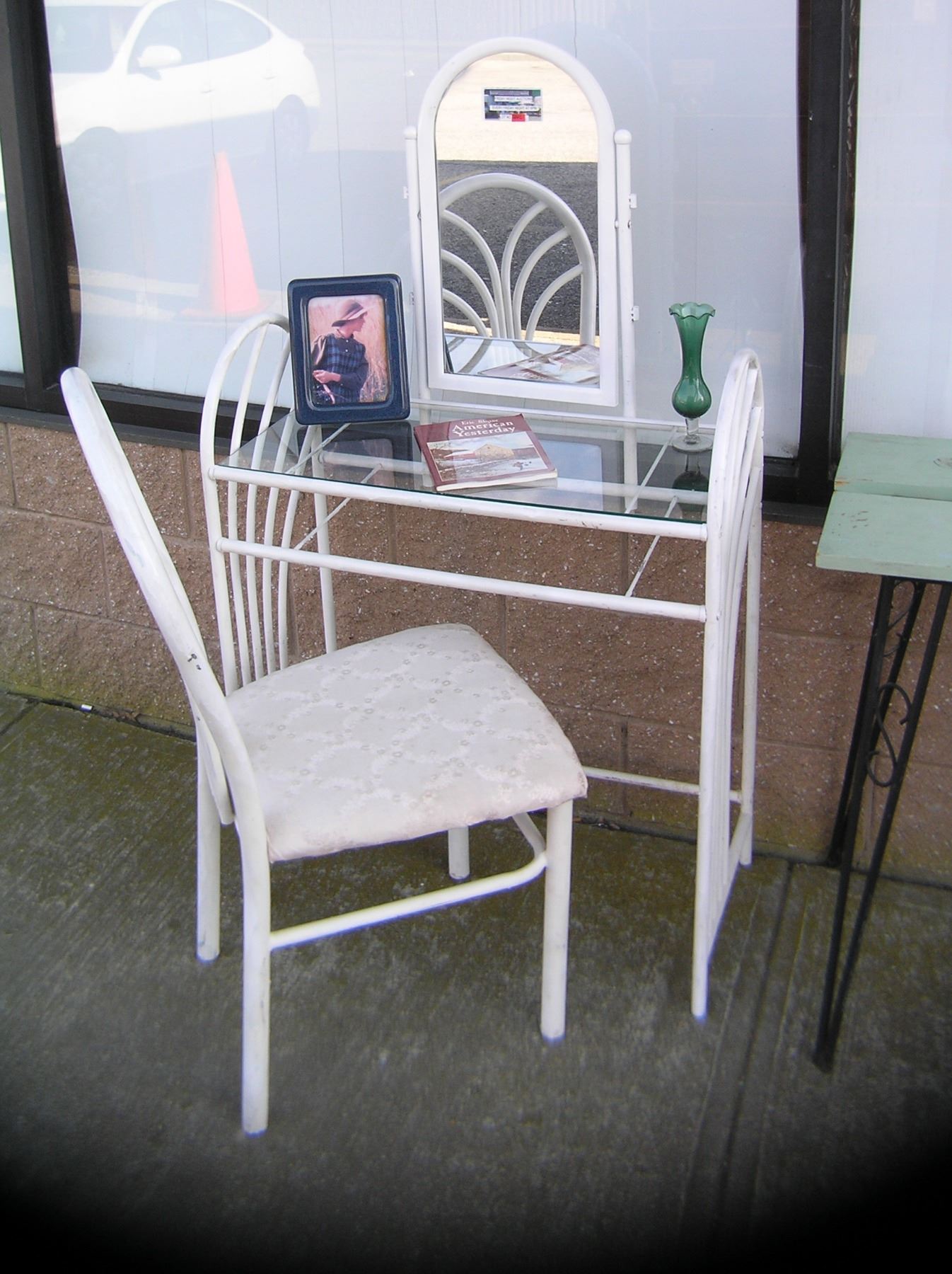 Vanity and chair set nice all metal and glass with mirror and upholstered chair part of a moving and storage company seized or unclaimed merchandise group sent to auction for liquidation est. value $100.00-$125.00