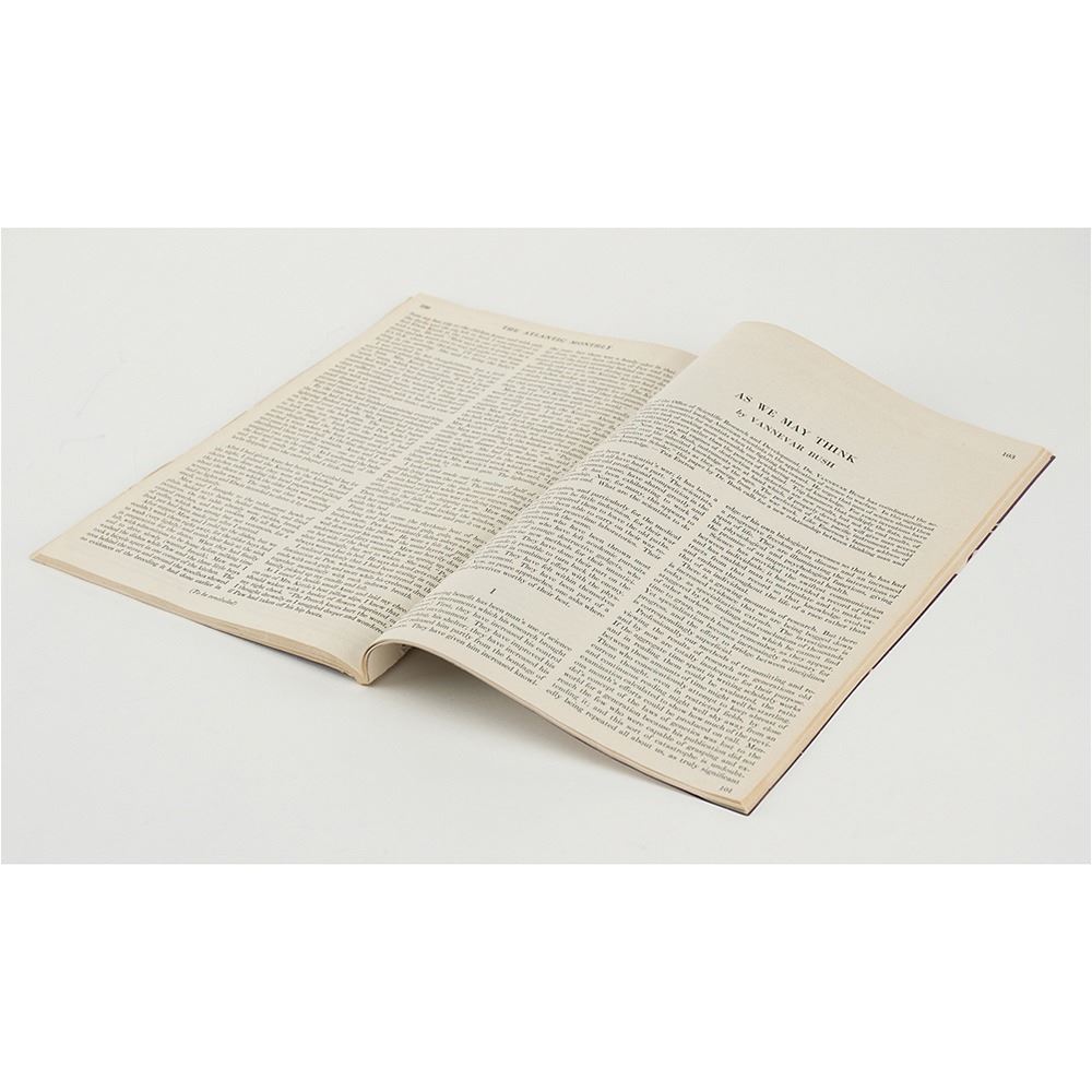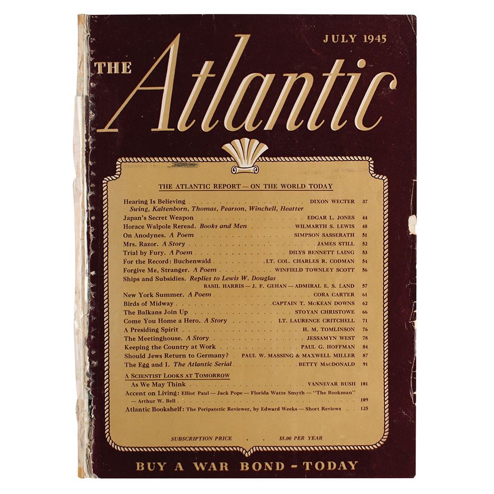 Hard-to-find complete issue of The Atlantic from July 1945 (Volume 176, No. 1), featuring the first appearance of Vannevar Bush's visionary essay, "As We May Think." Boston, MA: The Atlantic Monthly Company, 1945. Subscriber's edition in its original wrappers, 7.5 x 10.5, [1]-129,[5] pages. In good condition, with spine panel bare and reinforced by clear tape, front cover partially detached at top, tiny binding holes along left edge, and typical edgewear and light creases; interior clean and bright, with a clipped corner to the first page of "As We May Think" and a few trivial pencil marks to top margin of following pages.