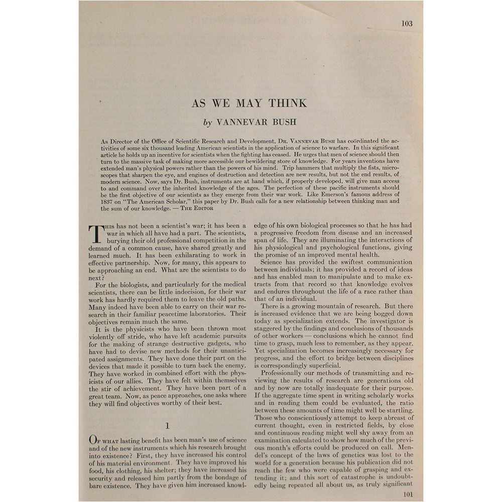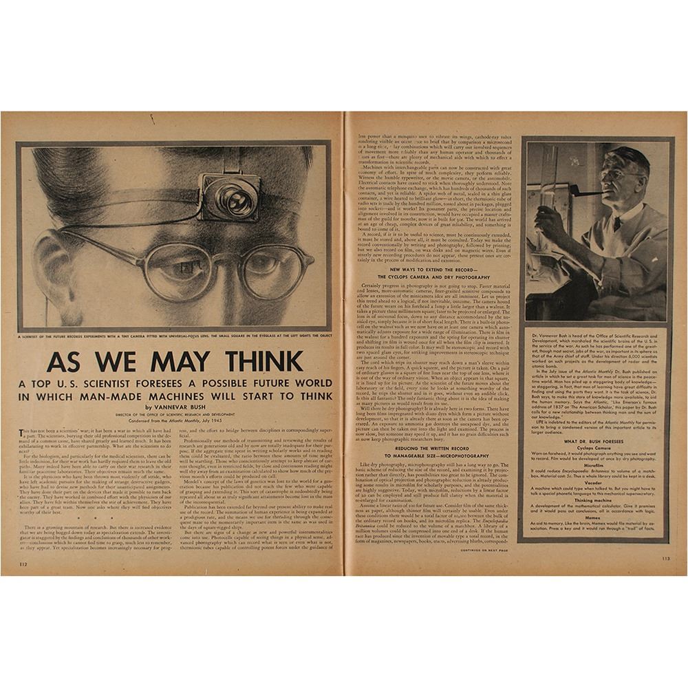Also includes a complete issue of Life from September 10, 1945, which features a reprint of "As We May Think" that includes illustrations of several of the concepts Bush puts forthincluding the proposed memex desk, automatic typewriter, 'cyclops' universal-focus lens, and other futuristic technologies.