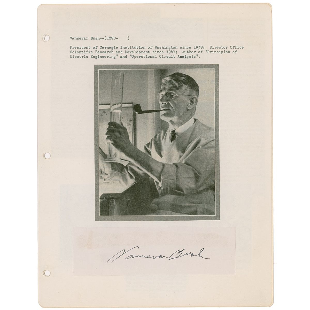Engineer (1890–1974) known for his pivotal role in the development of the atomic bomb as a primary organizer of the Manhattan Project. Vintage fountain pen signature, “Vannevar Bush,” on an off-white 6 x 1.75 slip. Slip is affixed to an 8.5 x 11 album page with an affixed clipped photo and biographical information. Area of light toning from show-through from adhesive on reverse, otherwise fine condition.