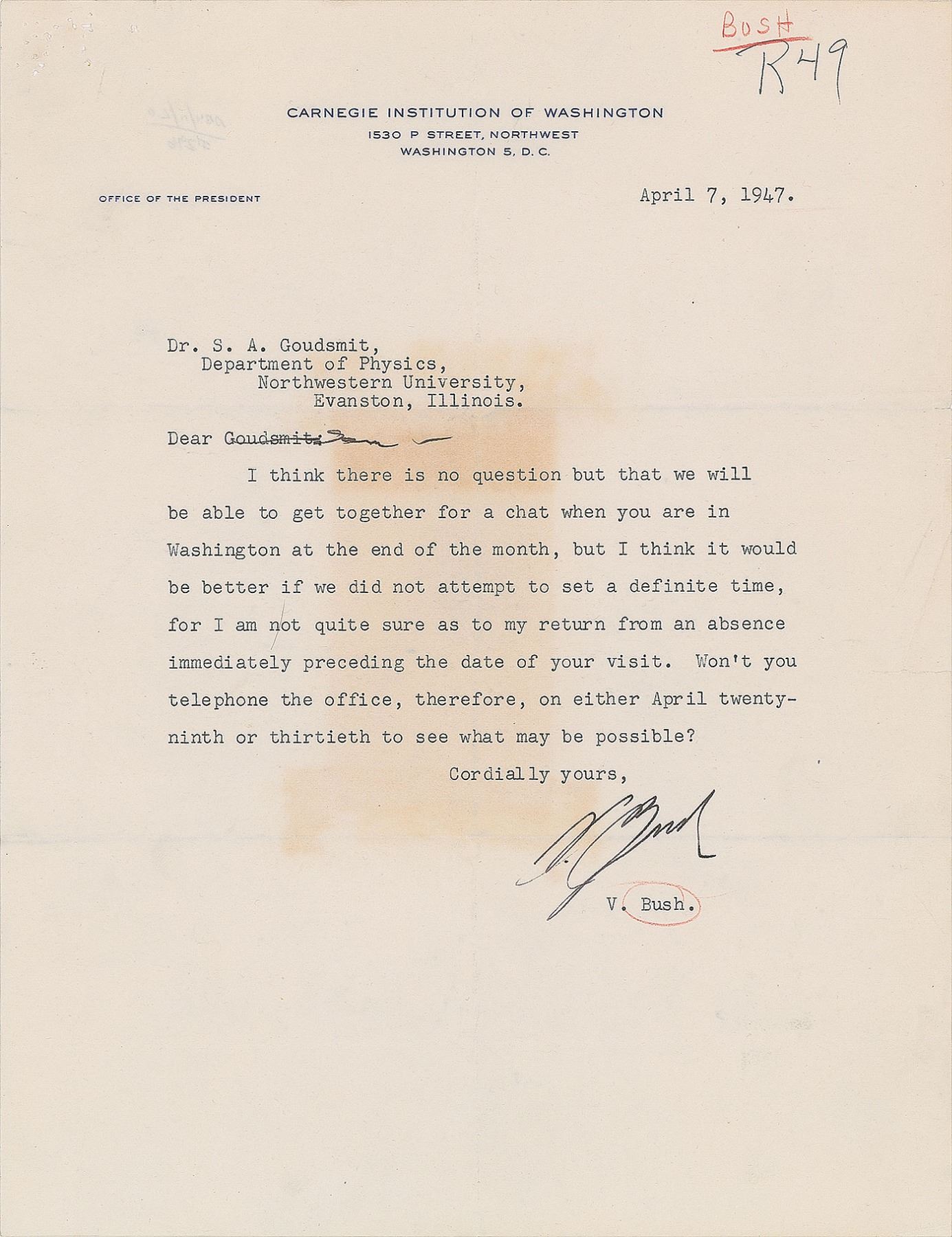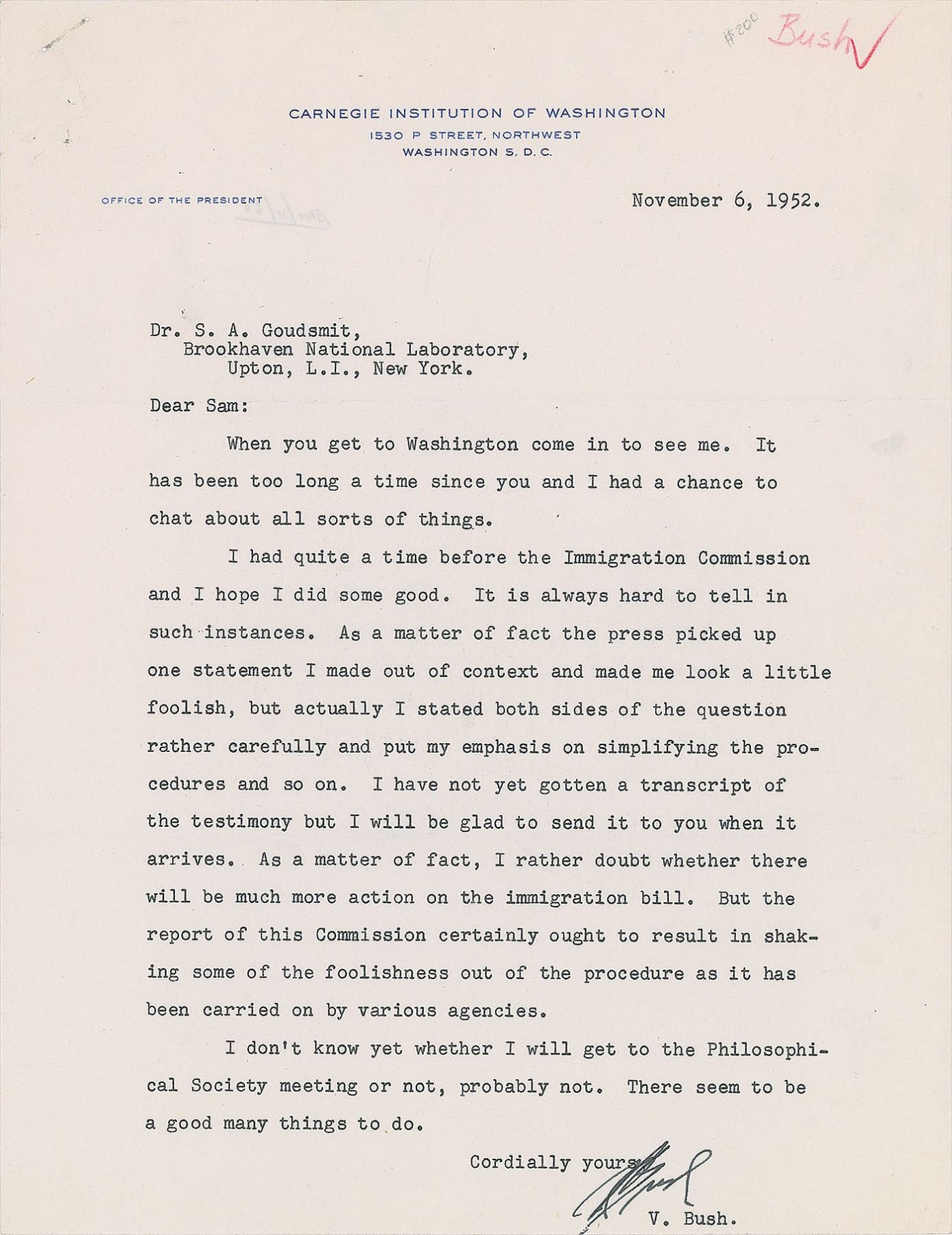 Engineer (1890–1974) known for his pivotal role in the development of the atomic bomb as a primary organizer of the Manhattan Project. Group of three TLSs, signed "V. Bush," each one page, 8.5 x 11, Carnegie Institution of Washington letterhead, dated 1947–1952, all to Dutch-American physicist Samuel A. Goudsmit. The first two mention arranging visits, and the third reads, in part: "I had quite a time before the Immigration Commission and I hope I did some good. It is always hard to tell in such instances. As a matter of fact the press picked up one statement I made out of context and made me look a little foolish, but actually I stated both sides of the question rather carefully and put my emphasis on simplifying the procedures and so on…I rather doubt whether there will be much more action on the immigration bill. But the report of this Commission certainly ought to result in shaking some of the foolishness out of the procedure as it has been carried on by various agencies." In fine condition, with staple holes to the upper left corners, and a block of light toning to the earliest letter.